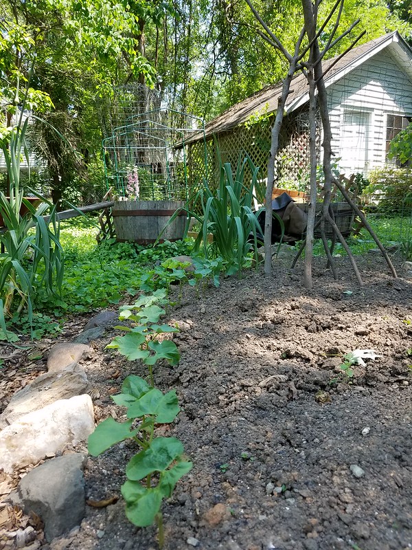 The Jacob’s Cattle beans germinated well. Not so much for the saved Henderson bush lima beans, but they were a bit old. I’ll replant in the blank spots. These were planted around the outer edge of the bed.