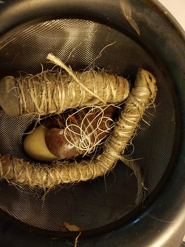 Anyway, I did a little eucalyptus bundle experiment with some leaves I found out back. They may be too old. I soaked them and wrapped some iron/vinegar mordanted cotton cloth and silk thread around sticks and a stone, then steamed them for an hour or so. I’ll unwrap them this afternoon when I spend some creative time with a friend. I should leave them wrapped longer, but I’m not that patient right now. Maybe I’ll do a few bundles and let them sit while I am gone for my long weekend coming up.