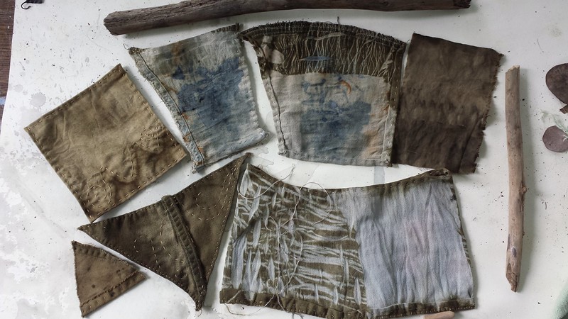 Now I’m going to play in the studio today and tomorrow. Yesterday I only wove a little on my tapestry diary. Still wrapping my head around that and how to proceed, if at all. I dyed some iron/vinegar mordanted pockets in tap water with onion skins and the rest of the pitcher of red zinger tea. I wrapped up one with a sprig of deep purple plum leaves and another with the tea bags. The tea bags didn’t do much but the plum leaves worked blue magic. I soaked these in a really strong mordant for days so my colors are very dark. Love the olive color, though.