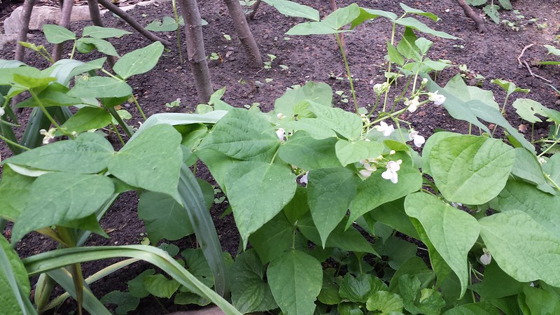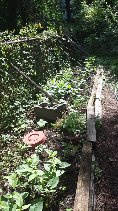Most of the tobacco sticks I brought from the farm have rotted in the humidity of the garden, but I have saved long poles from tree trimming and house renovation. There are some squash, pumpkin, and watermelon plants in there. I hope that they have a fast growth spurt to get above the butterbeans!