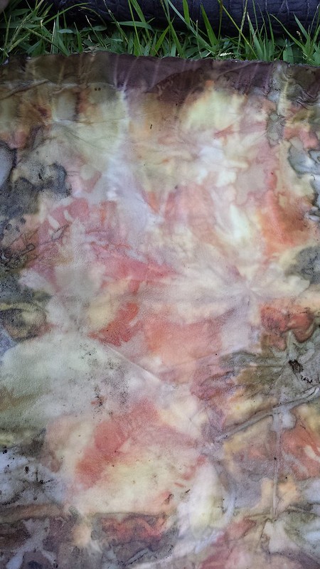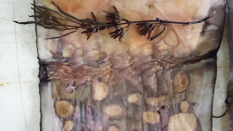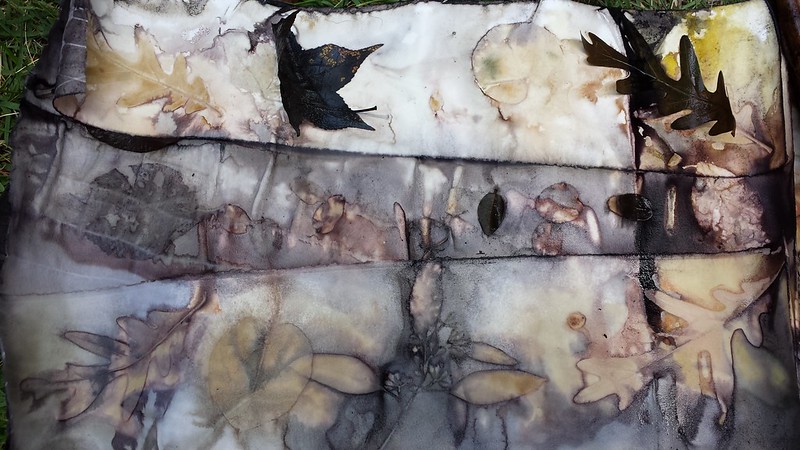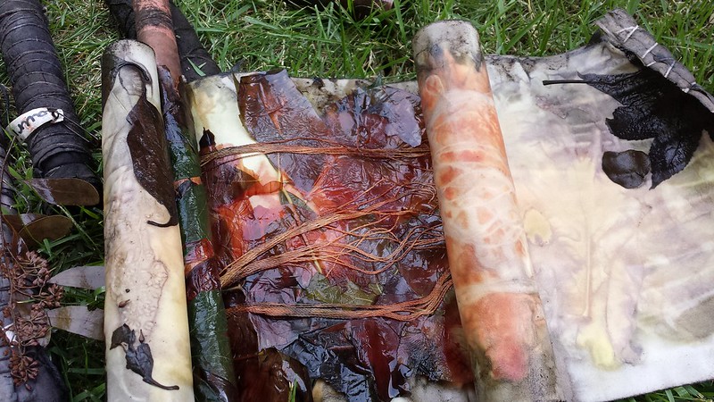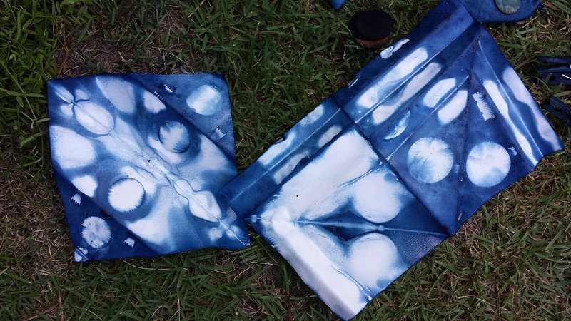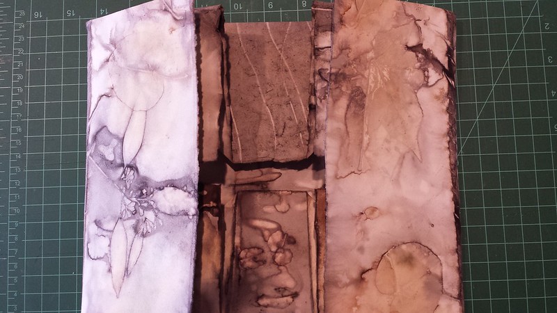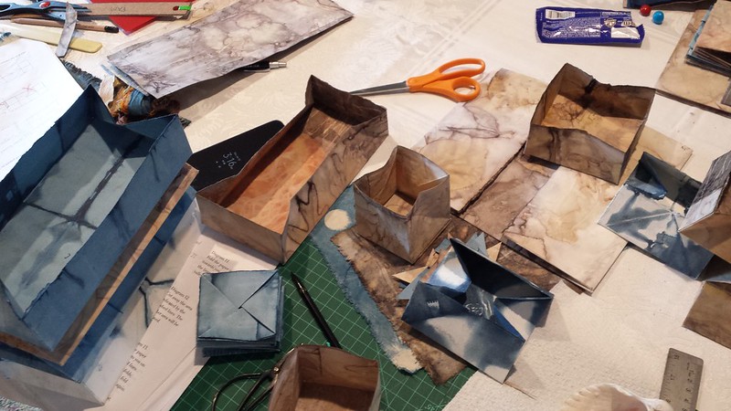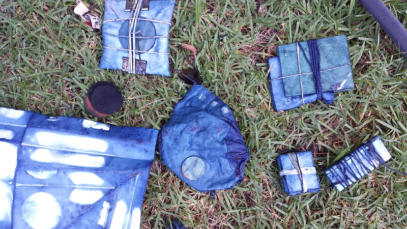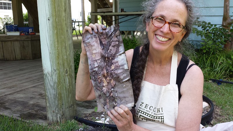 This past weekend, Susanne and I went to a wonderful Zhen Xian Bao book class at Topsail Beach, NC, taught by Leslie Marsh and Kim Beller. The first day we spent natural dyeing with plant materials and indigo on paper and fabric. The next day was spent constructing the book, which is made with glue, scissors, and folding. The book structure is a traditional Chinese thread book made for the purpose of holding embroidery threads, needles, and the odd bits that might be kept for different projects. Ruth Smith researched this extensively and published books about it, and it is being taught by artists in the United States now. I took a class on this structure at Focus on Book Arts last summer, which I absolutely loved. Kim and Leslie put their own spin on it by adding more layers and the natural dye/shibori element. Of course, Leslie acknowledged the instruction of India Flint in her teaching of eco-printing techniques.