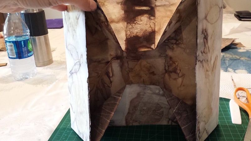 The big dilemma in making this book is that you have to sacrifice some images that you might love to be on the side that is glued down. The biggest one for me was the big box that makes the base and the cover. Both sides had their charms, but I had to pick one. The other can be seen on the bottom of the lowest box when the book is opened. I thought about embellishing the cover further, but I think that I will leave it alone other than brushing some Dorland’s wax medium on it to make it a little stronger and more weatherproof.