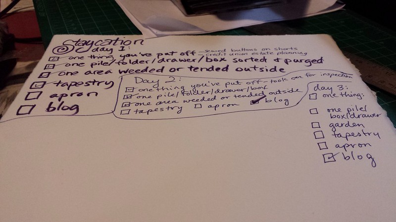 - Get something done you’ve been putting off. (Monday it was going with Sandy to a will planning meeting at the credit union and sewing buttons on my favorite pair of shorts. Yesterday I dropped one of the cars off at the mechanic for an inspection and oil change.)