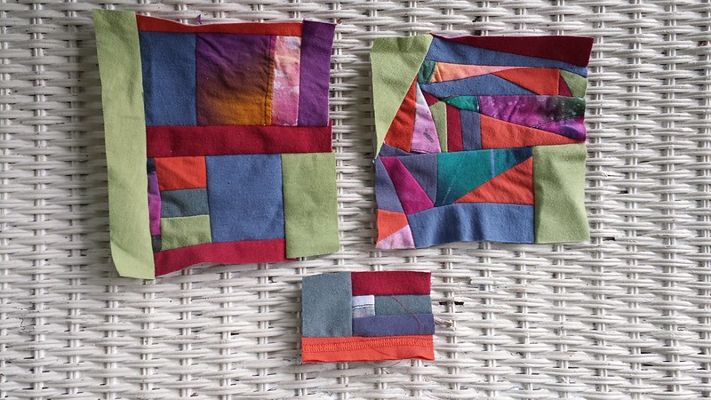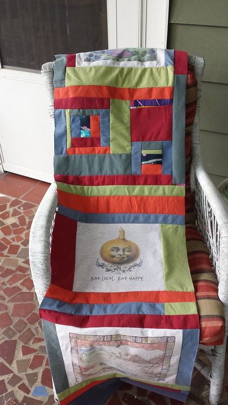 When we finished errands yesterday I sat down with my t-shirt scraps and worked on the t-shirt blanket. Or I should really say played, because I got into it so much that I lost all track of time and didn’t want to stop! I finished putting together one of the panels for the back side – it will be reversible, but I think of this as the back side. And played with sewing all these little scraps together. So much fun, and I made myself throw away the teeniest scraps instead of hoarding them for paper or whatever. There was a while when my intention was to use up every bit of everything. Nice concept, crappy reality in a small house. I don’t think that I will put a batten between the two layers. I’m going to just sew the layers together in a grid.