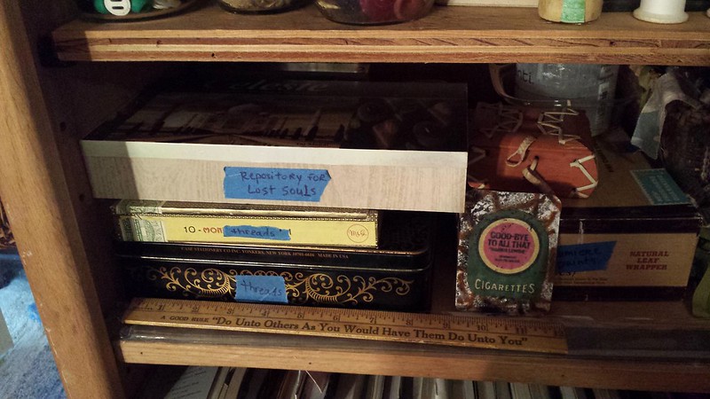 I really loved the look of Leslie Marsh’s studio when I went there for a book workshop earlier this summer, and my friend the fabulous Zha K was getting rid of most of her possessions to sell her house and get the hell out of North Carolina, so she gave me a lot of baskets and cigar and wine boxes and candy tins. I’ve slowly been transitioning my studio storage over to these boxes and baskets and, most importantly LABELING THEM, and I’ll give the plastic bins to Goodwill or Salvation Army or wherever. This is mostly an aesthetic feel-good action, but I’ll take my feel-good where I can get it these days.