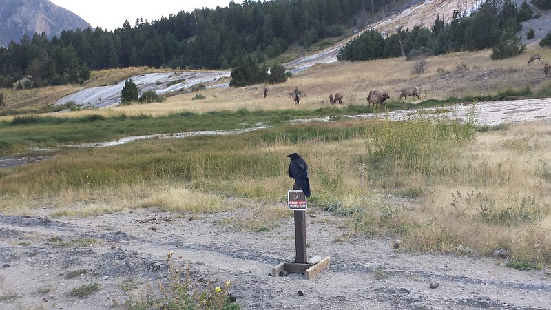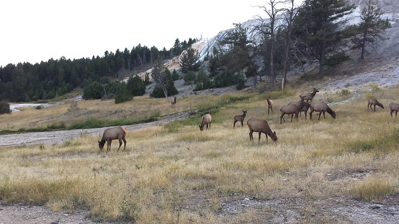 Once we got to Mammoth Hot Springs Terrace, there was a large herd of elk in the meadow between the parking lot and the terraces. We would learn that this herd hangs out around the hotel and headquarters complexes there, including in front of our cabin.
