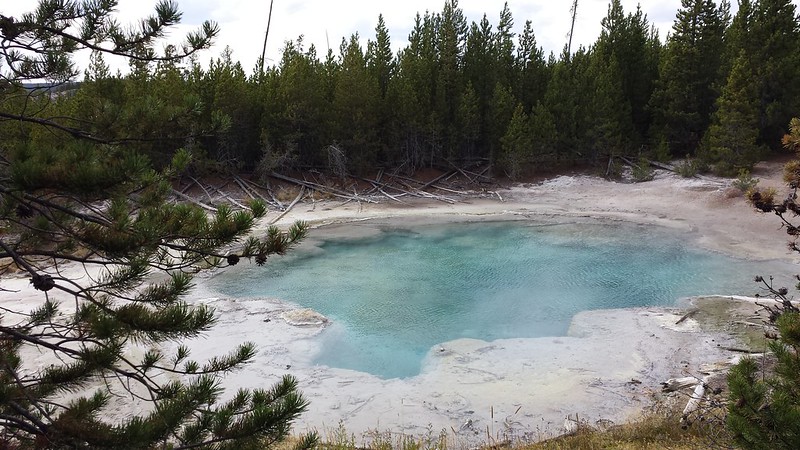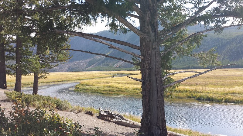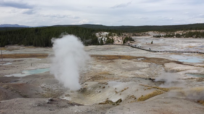 Rolling into Yellowstone National Park, we saw anglers, elk, and bison in the Madison River. We turned toward our destination and stopped at the Norris Geyser Basin, hiking down to see Steamboat Geyser, which had become active early that morning. This is the world’s tallest active geyser, going up to 300 feet in a major eruption! There was a long boardwalk trail that led to many other geysers and hot springs in the basin. We did not go farther, but I did check out the Porcelain Basin before we left. Parking was a bit scarce, so I can’t imagine what it must be like in July or August on a weekend.