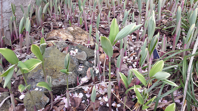 This variegated solomon’s seal is perfect for this soggy spot where rainwater runs out of the gutter. A purchase of three plants about ten years ago now fills in an otherwise difficult shady wet spot in my front yard. The flower spikes and foliage is gorgeous. It is just now emerging from winter’s sleep.