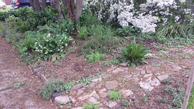 Concentrating on the sunny side of the front garden now. Planted a eucalyptus here and a bunch of peppermint on the strip between my stone walk and the neighbor’s lawn on the other side of our house. This strip is actually on their kind of the property line. I plan to put potted pepper plants there too. I dug up a lot of the herbs from this side and transferred them to the hugelkultur bed, so it has room to grow.