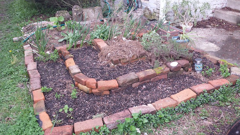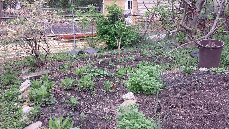 One good thing that came from the construction next door is that I was able to retrieve enough old bricks from their digging to build up my front hugelkultur bed another layer. Great, because the area in the front used to contain potted veggies and the ground beneath that is hard rubble. I planted a lot of mint in the most shallow layer. Chives went on the bottom too. They aren’t happy, but they will probably perk up. Just planted basil, borage, arnica, sunflowers, snapdragon, and milkweed seeds in the past couple of weeks. Some of these seeds were saved and I am just giving them a chance. My friend Anne gave me some clay balls with coriander and curry seeds embedded in them so they’re in there. This should look great by the time we get back from our vacation in May.