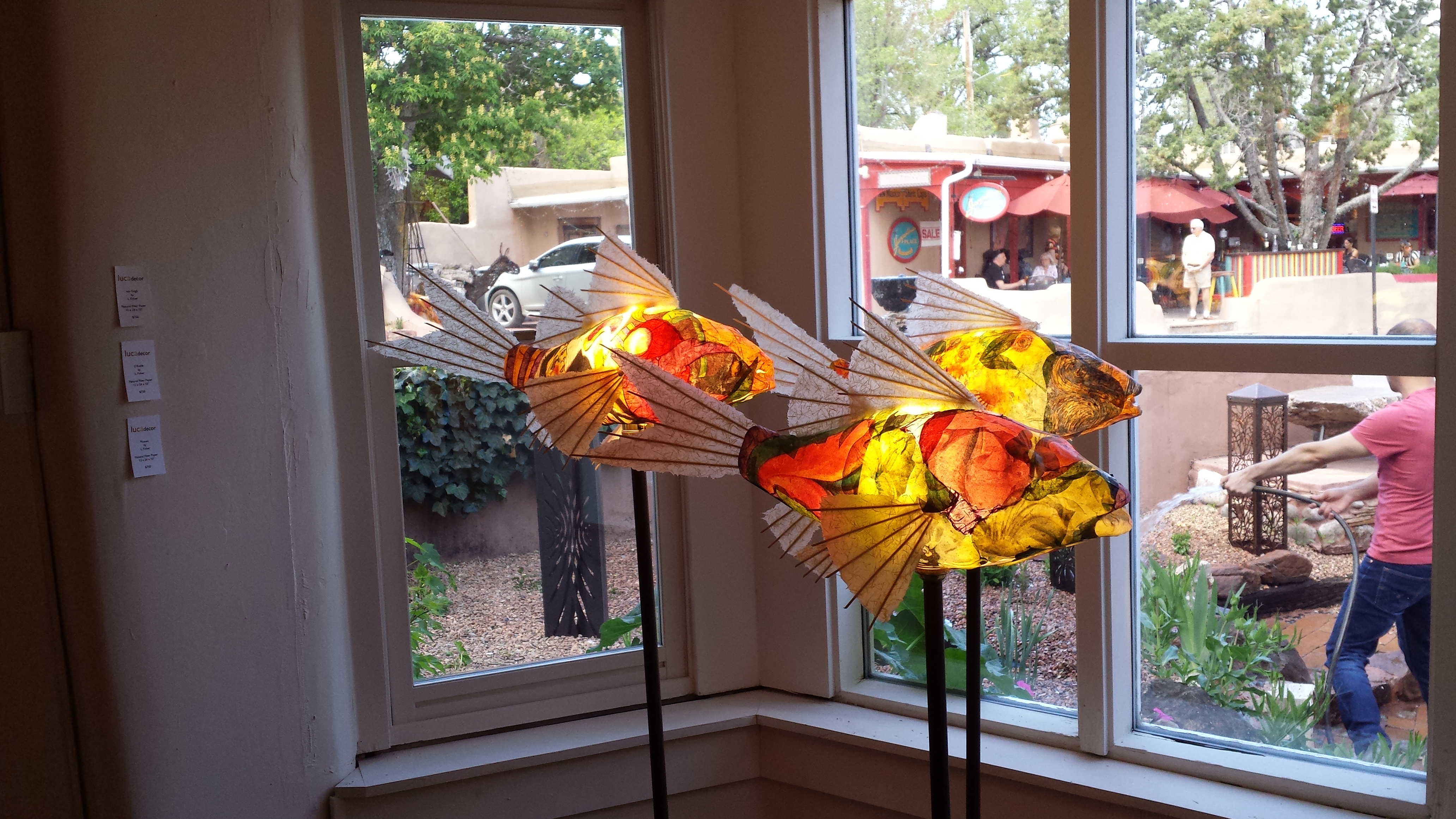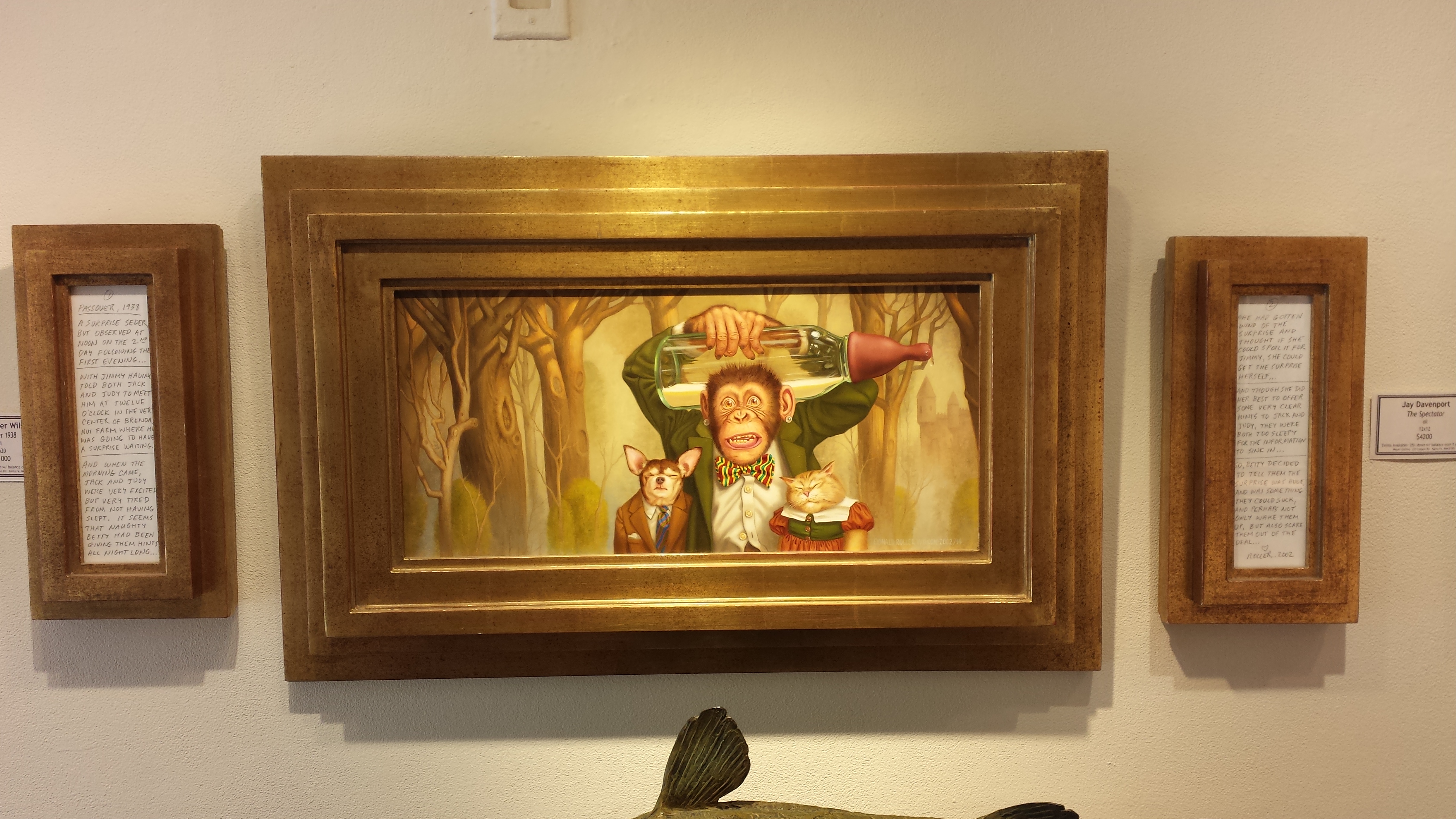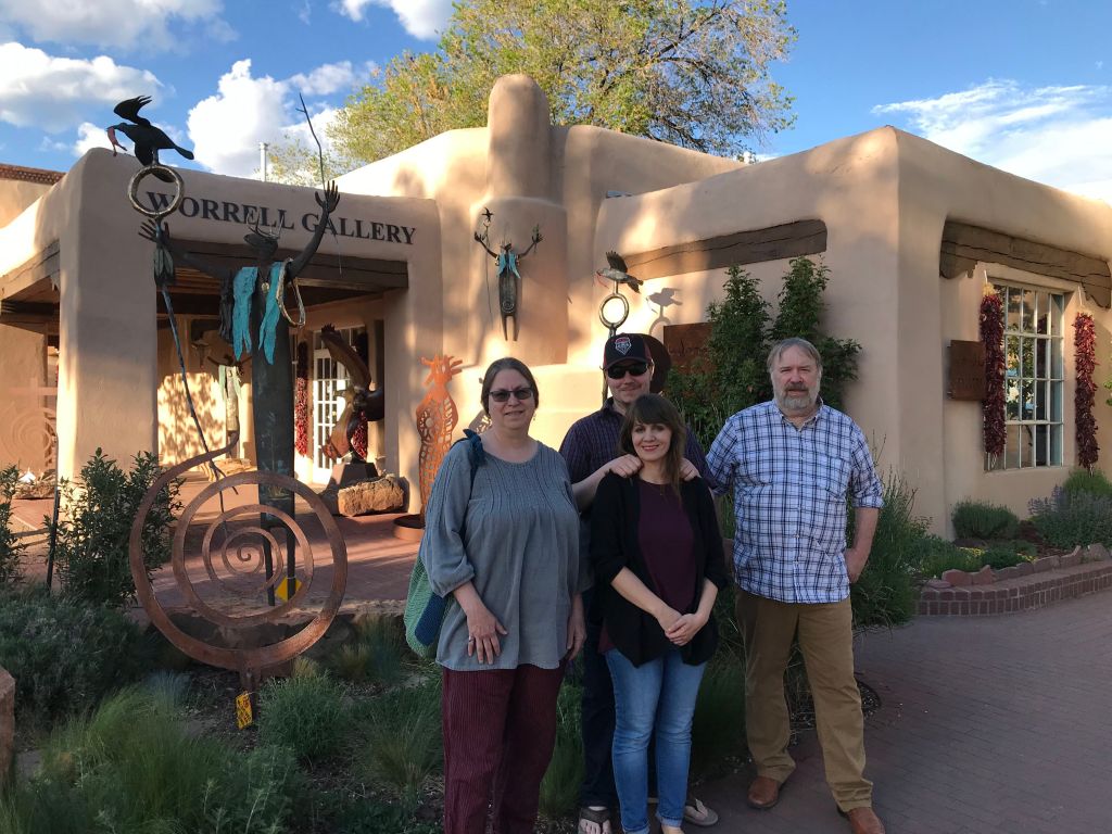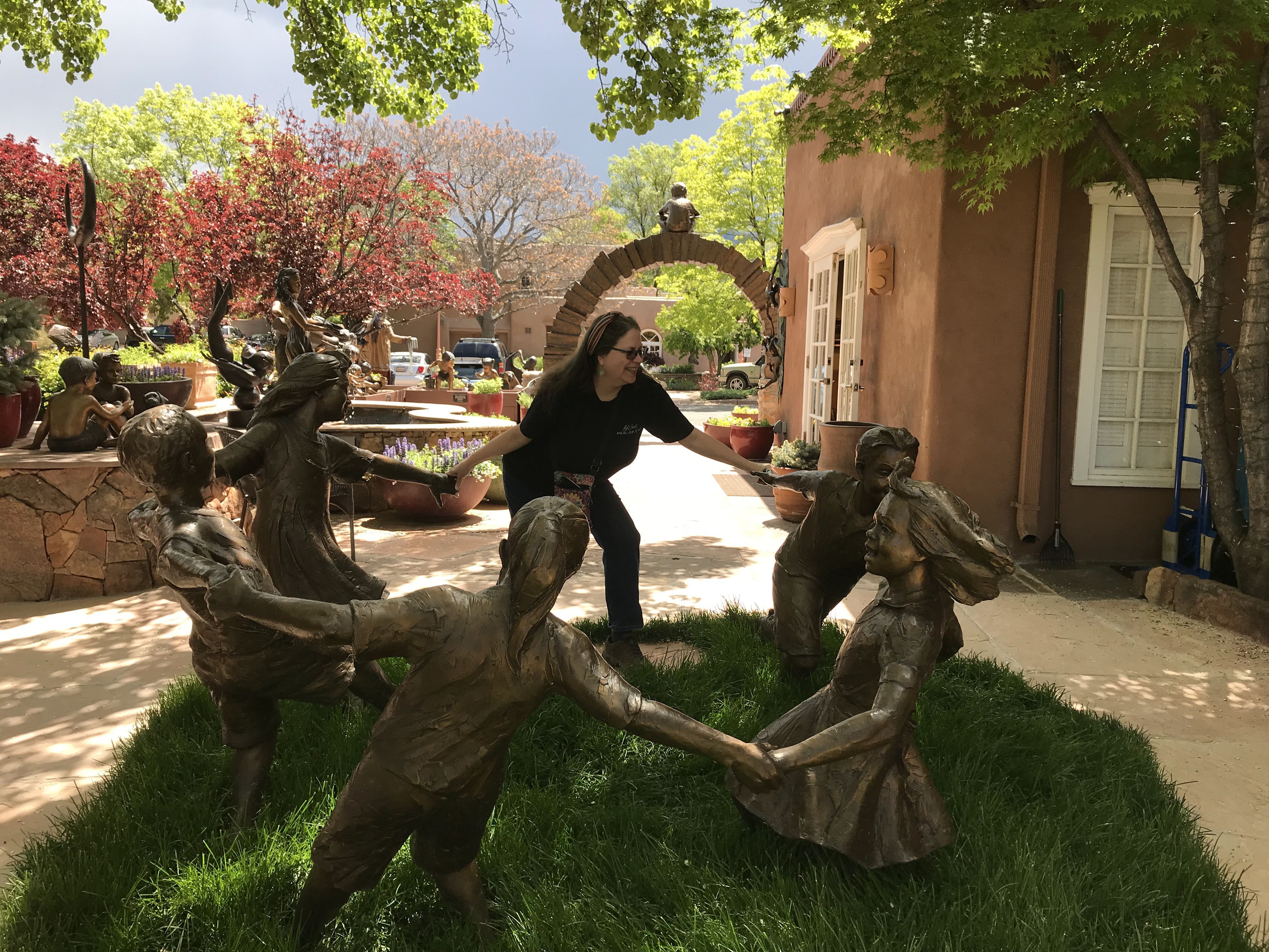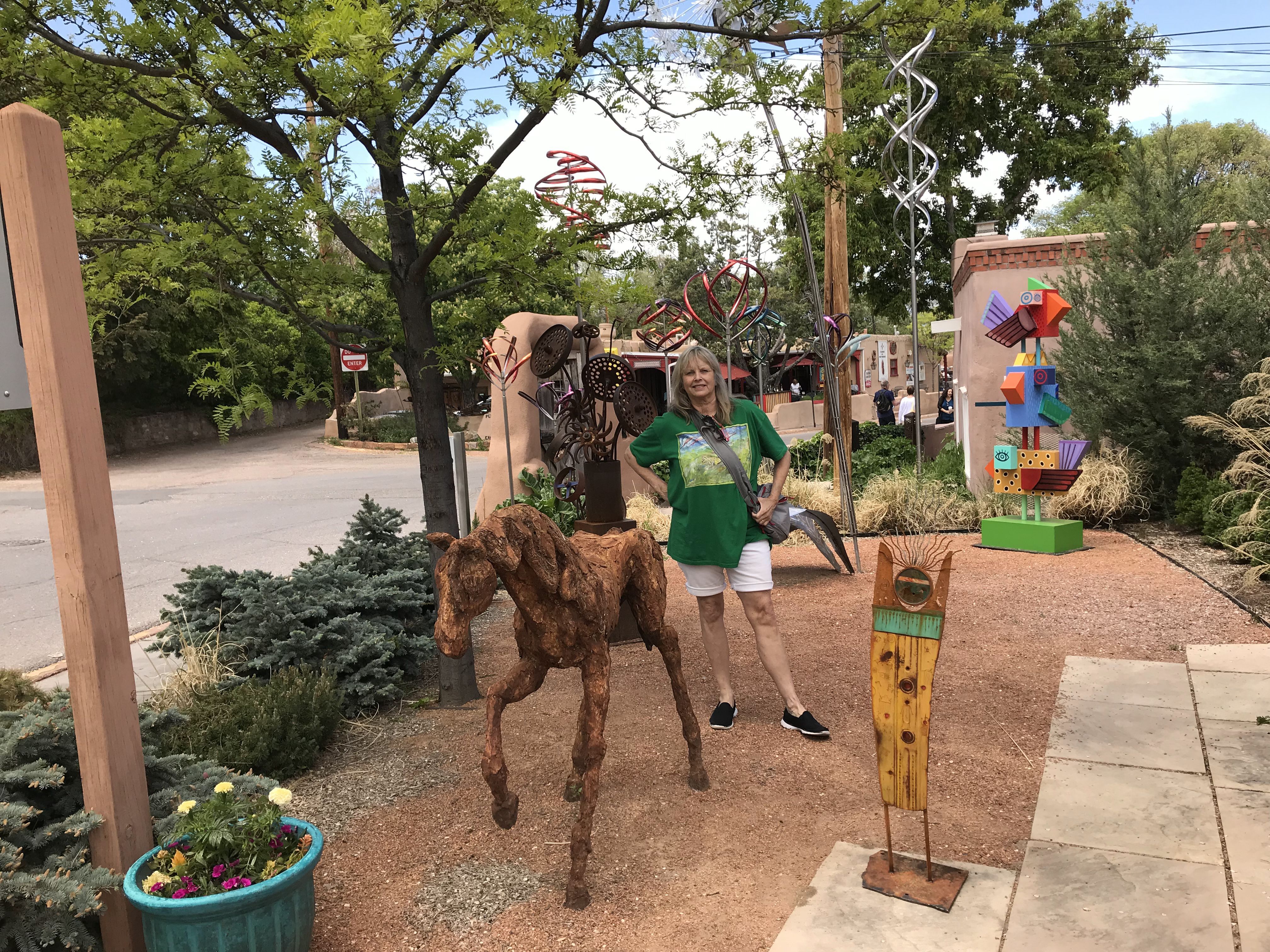 On Tuesday morning, we decided to tour a few of the bazillion art galleries in Santa Fe. Turns out that many places are closed on Monday and Tuesday, in case you are making plans, but there were plenty enough open. We headed over to Canyon Road and wandered in and out of several galleries there, and of course Sandy and I had to pose with statues. One of the galleries represented Donald Roller Wilson, who I fell in love with in the late 80s but had forgotten about. I was so surprised to see his work and the gallery owner was gracious enough to let me take a photo. Seriously, click on the link and open whatever it tells you to do. You won’t regret it if you love fun and weirdness and bizarre storytelling.