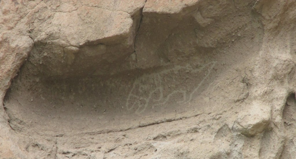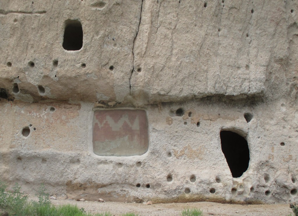 If you go to my photos on Flickr and open them on a large screen, you will likely see many petroglyphs. As we stood there looking at these walls, we kept finding more. The holes in straight lines indicate where the lodgepoles supported the roof of the rooms that were built in front of the cliff. Some holes were hollowed out and worked into rooms inside the rock. The walls of these pueblos were usually covered in plaster. The pictograph below was found behind some plaster and preserved against the elements.