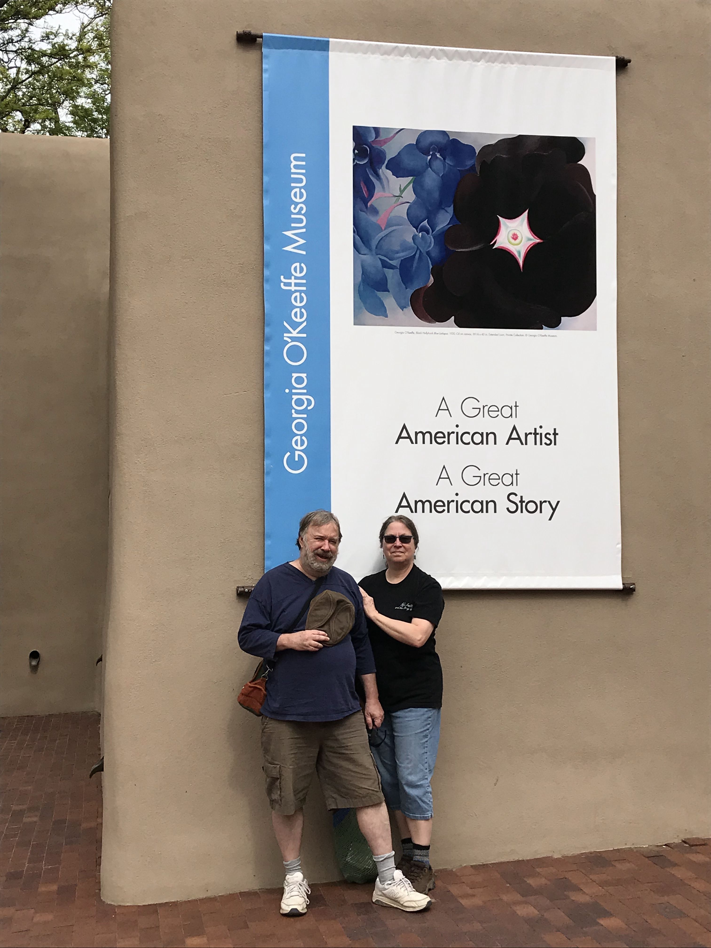 As much as I’d like to show some photos of the Georgia O’Keeffe Museum, which was our first stop on Thursday morning, somehow there are no photos. My camera was dead and I know that Sandy and Cherie were clicking away. Hmmmm. Spirits interfering? Anyway, the camera worked outside the museum. As you might expect, seeing so many of her paintings in one place was very inspiring, and it made me want to reread the biography of her that I read several years ago.