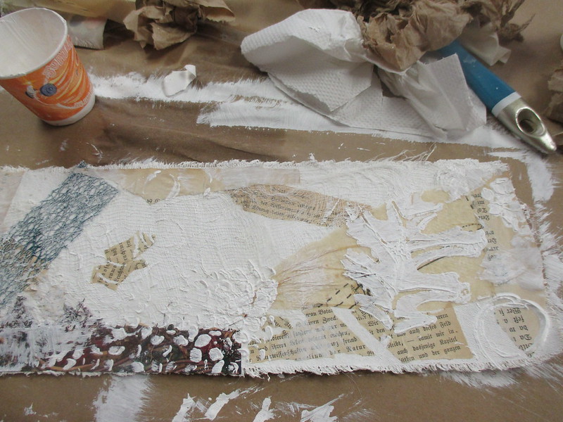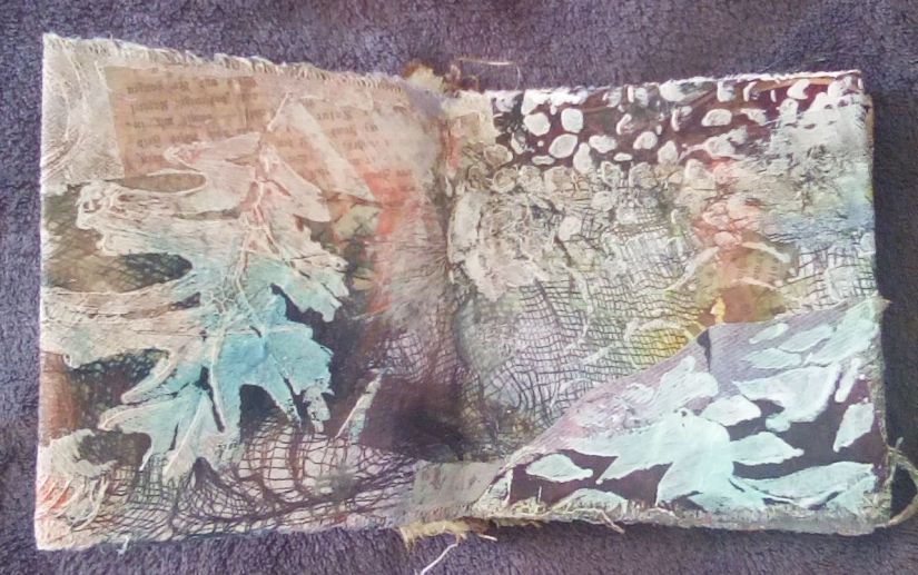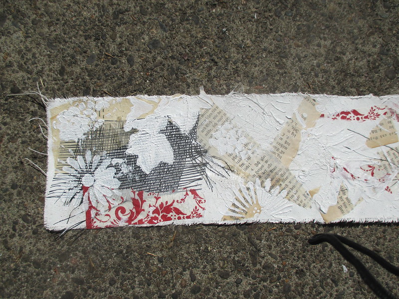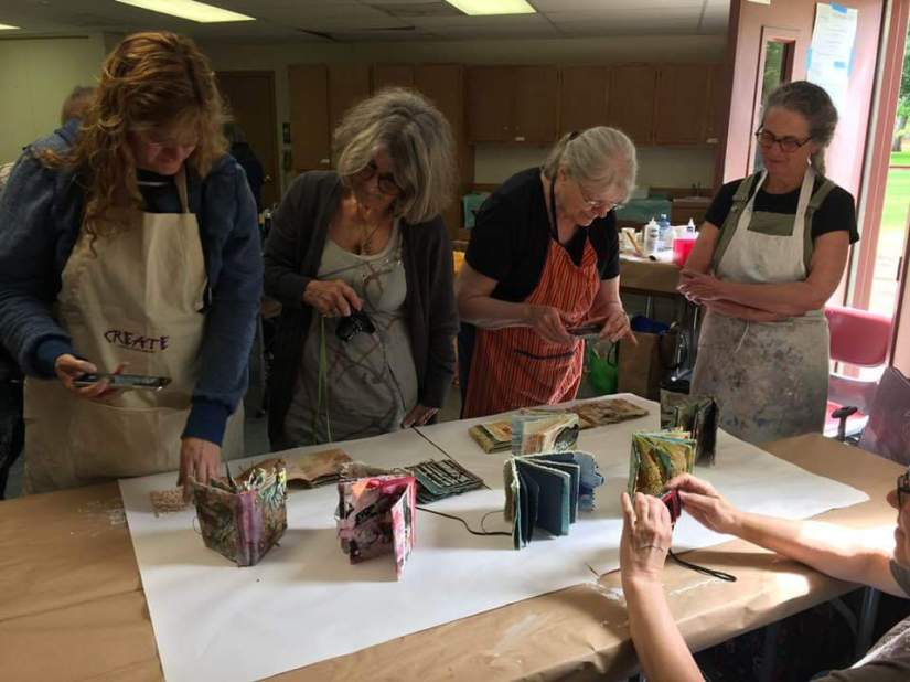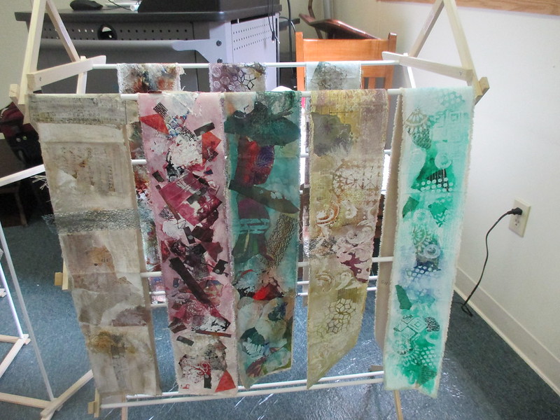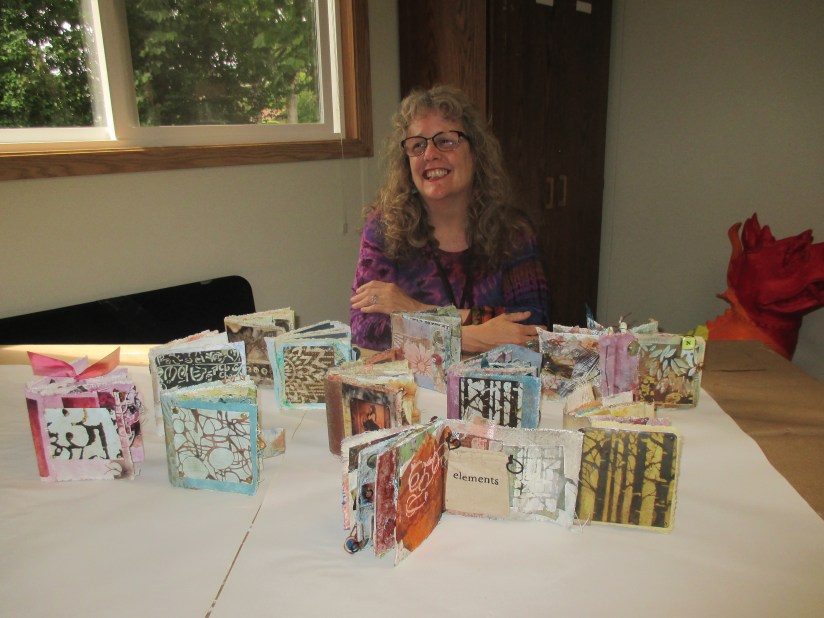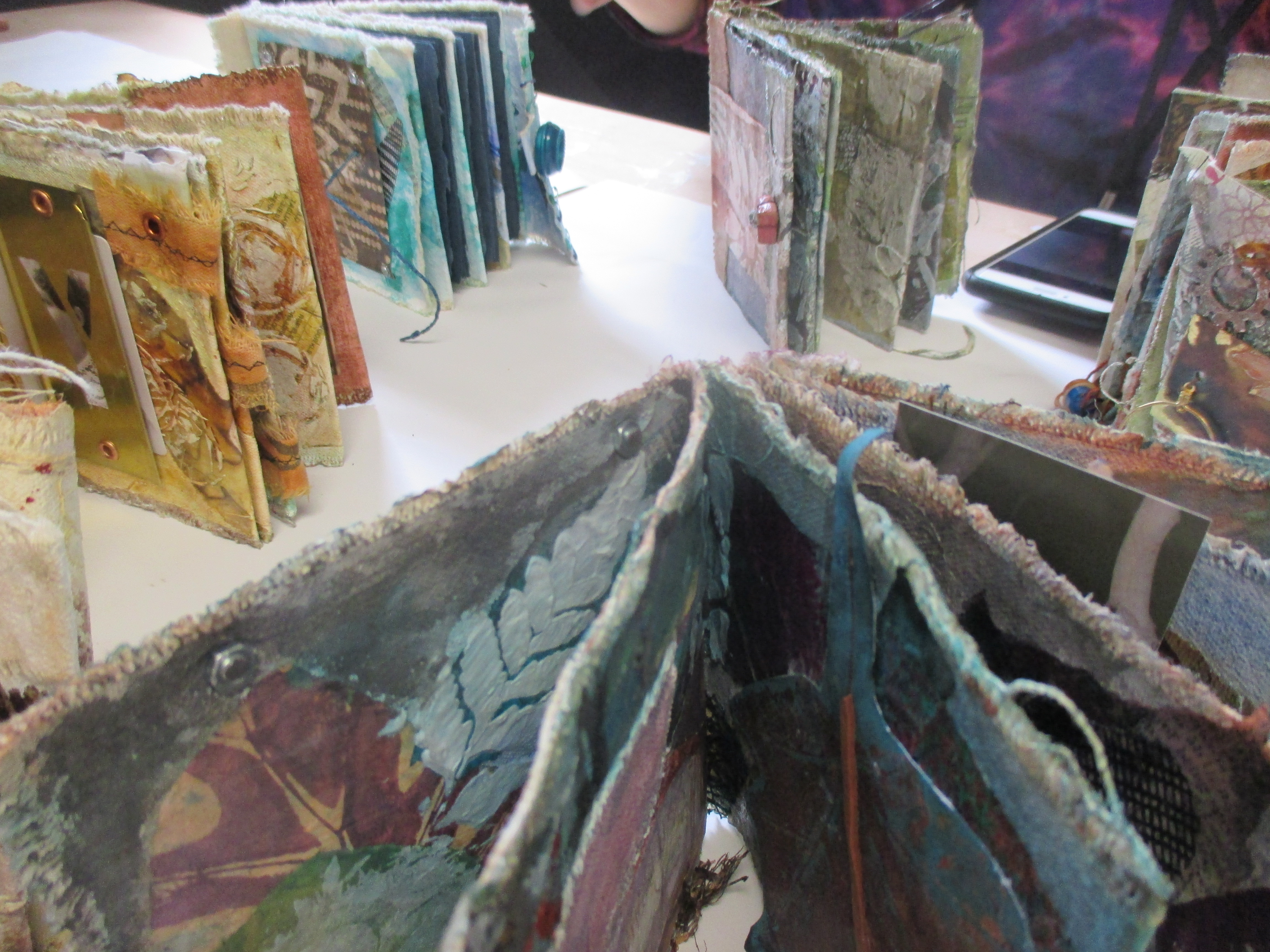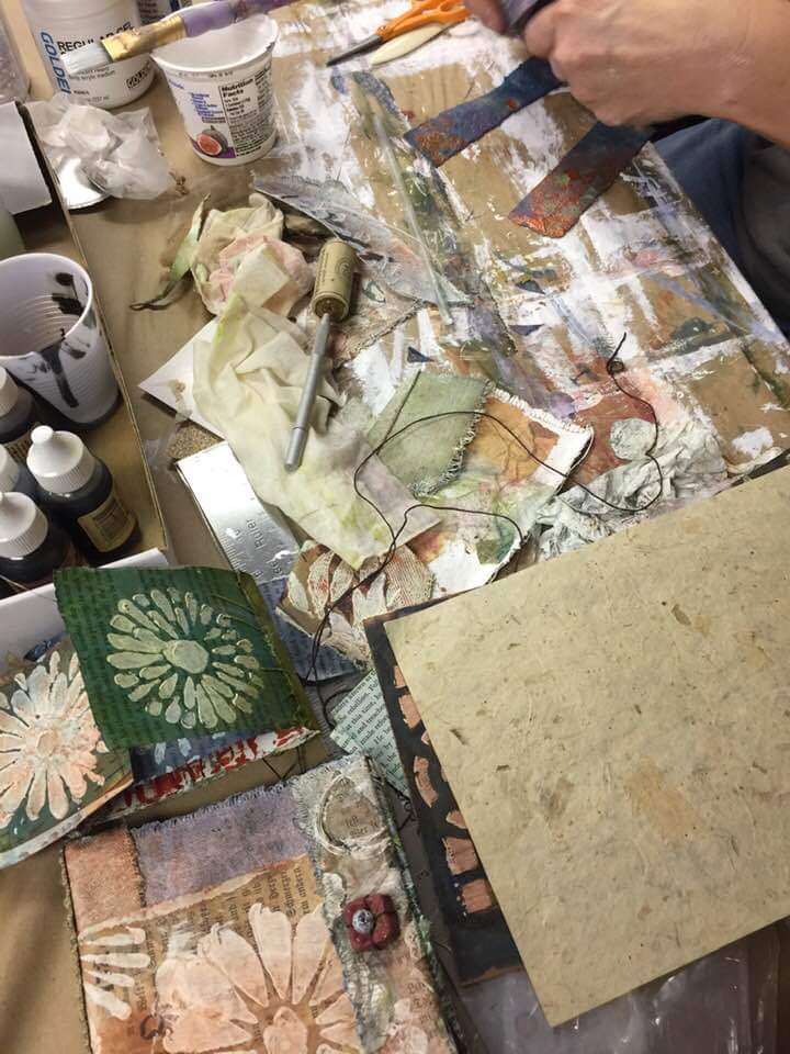 My first class at Focus on Book Arts was with Leighanna Light, titled “The Construction of an Art Book.” Susanne and Kathy joined me for this one. For two days we collaged, painted, and stenciled a strip of canvas that was folded and glued into a book. We also stenciled onto metal pieces and applied chemicals for a “faux etching” effect.