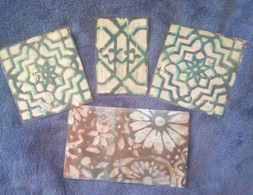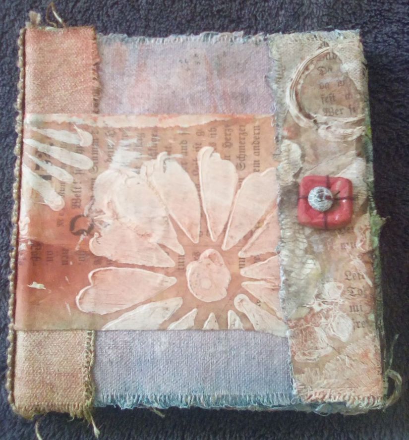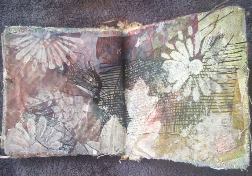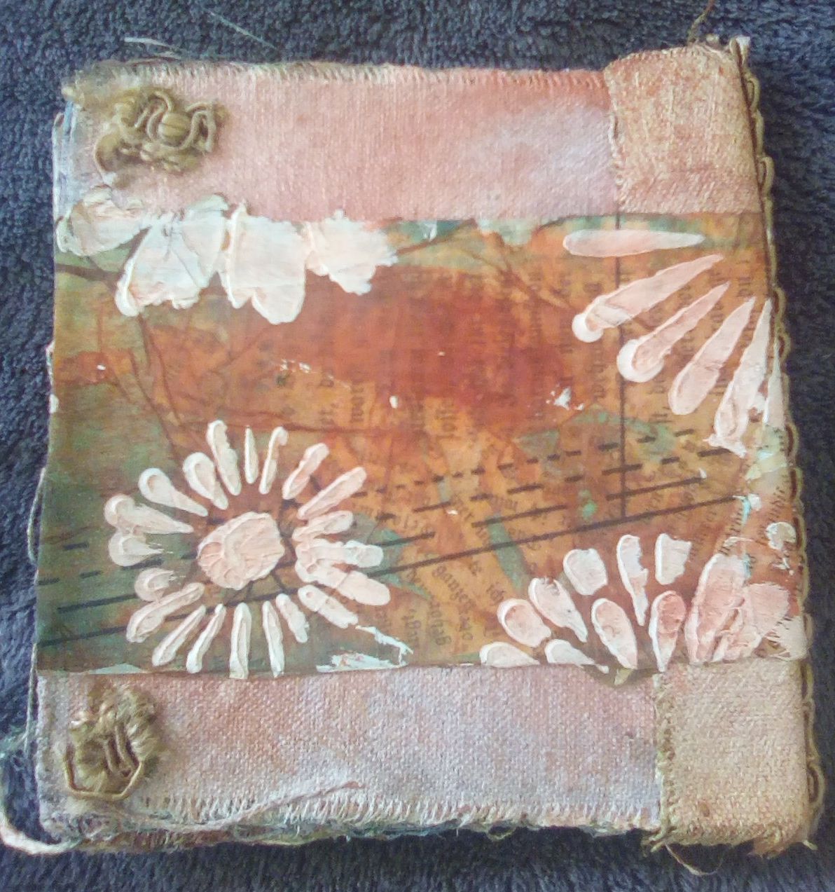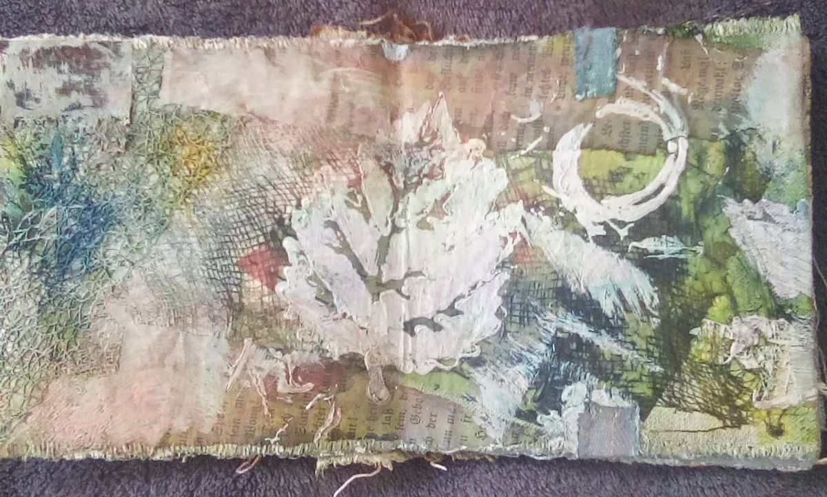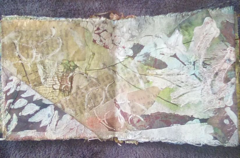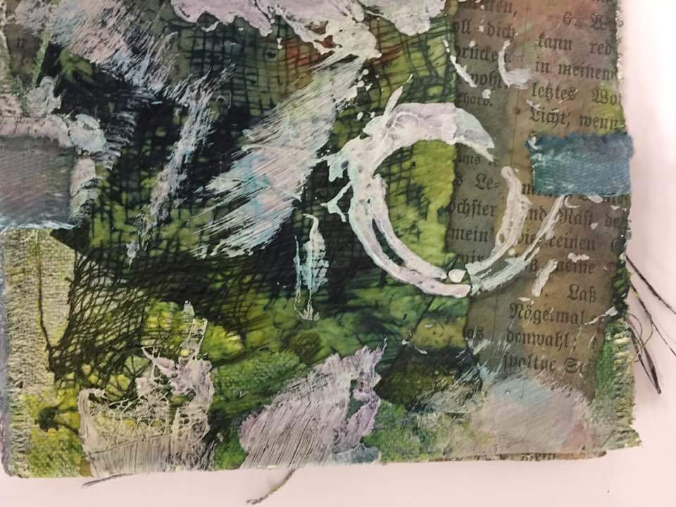 My first class at Focus on Book Arts was with Leighanna Light, titled “The Construction of an Art Book.” Susanne and Kathy joined me for this one. For two days we collaged, painted, and stenciled a strip of canvas that was folded and glued into a book. We also stenciled onto metal pieces and applied chemicals for a “faux etching” effect.