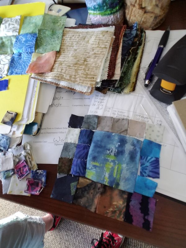 The week before fall semester classes begin is always a huge adjustment. It feels like going from 0 to 60 suddenly. Gone are the quiet days with few people on the hallway. Now I get to meet about 30 new people and do some public speaking. I’ve come to think of this as my “Sanity Box,” a little box of magic that I can take out during a lunch or other break and just hem squares or stitch them together. No major thought is going into this. Just doing.