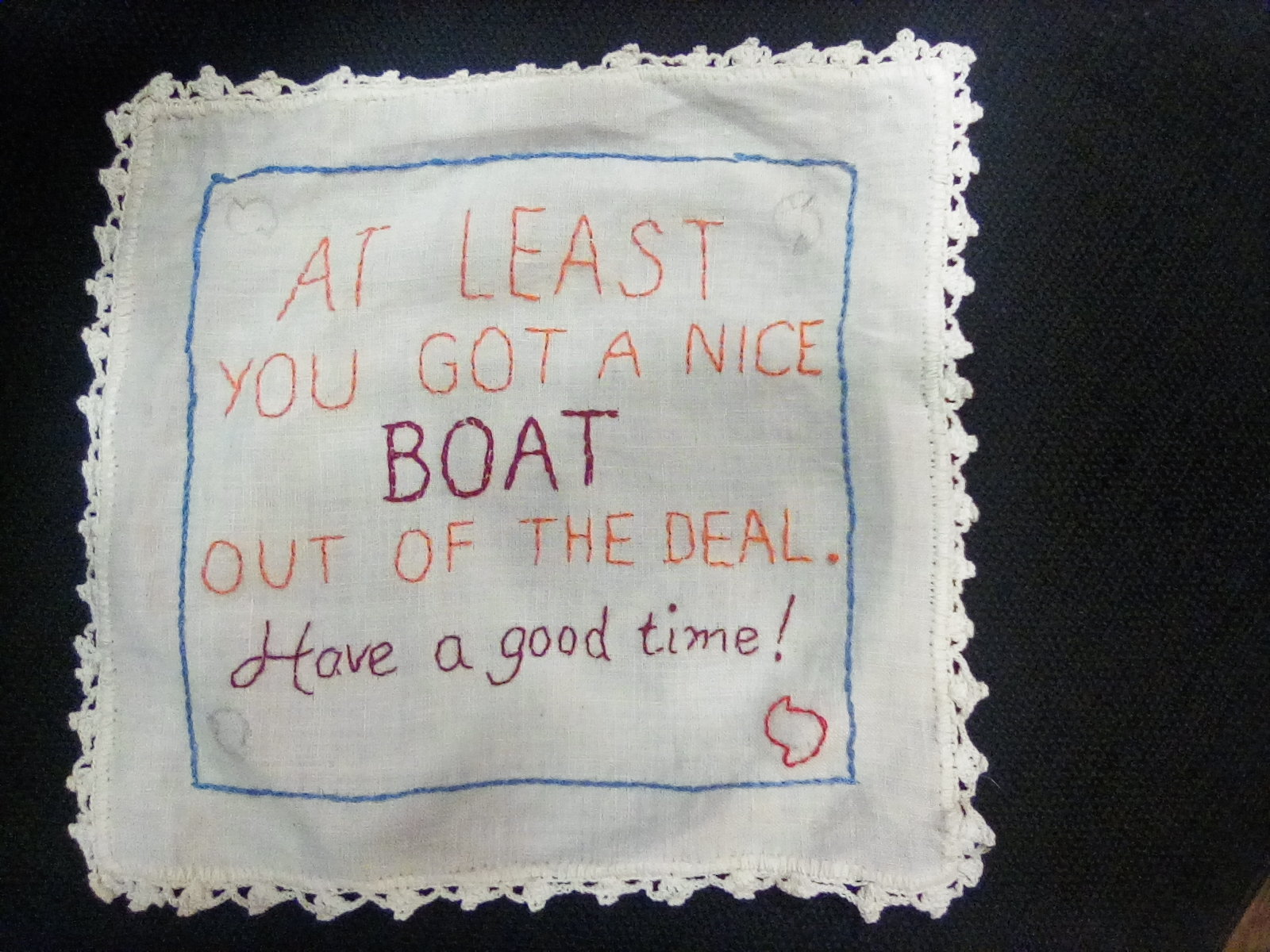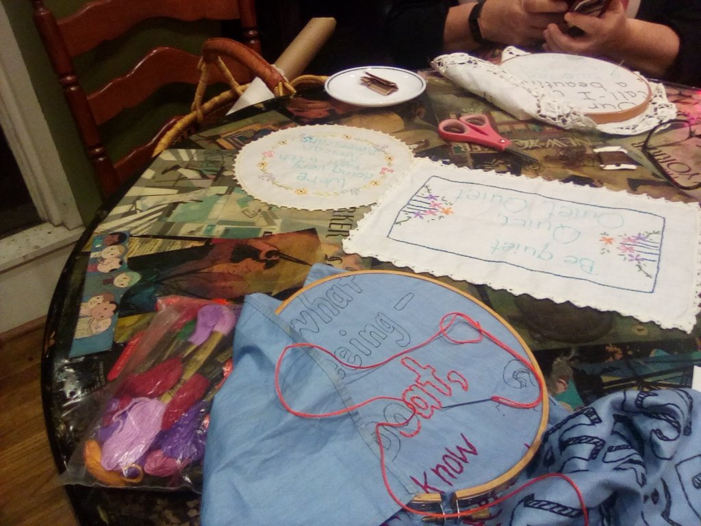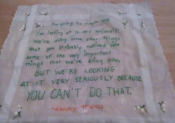 For the past month, I mainly concentrated on the Tiny Pricks Project, but I have done some other fun art things. My most recent Tiny Pricks project is a large tea towel so it is taking a while. I should get it done tonight, hopefully! Scuppernong Books has already started pinning up our handkerchiefs, doilies, and crafty items spotlighting the unmatched wise words of our very, very brilliant Dear Leader, and we will add a few more before we send them all to Diana Weymar and the big Tiny Pricks Project. This has been very good for me: good for my stress level, my sense of humor, and connection with other people. I made new friends, which is not easy for me. You can see the Greensboro chapter’s projects on Instagram. I have finished three and three of the four are related to hurricane quotes.