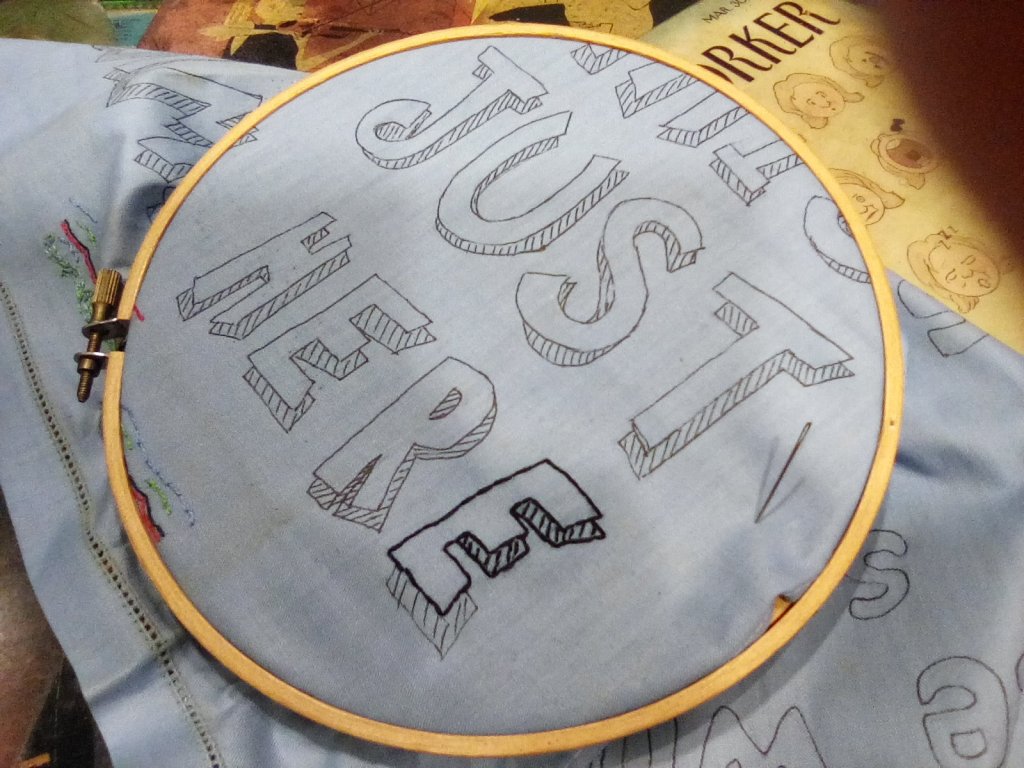 About ten of our Tiny Pricks embroideries were hung at Scuppernong Books for a few weeks around Thanksgiving until Lisa sent them off to join the big exhibition in New York.