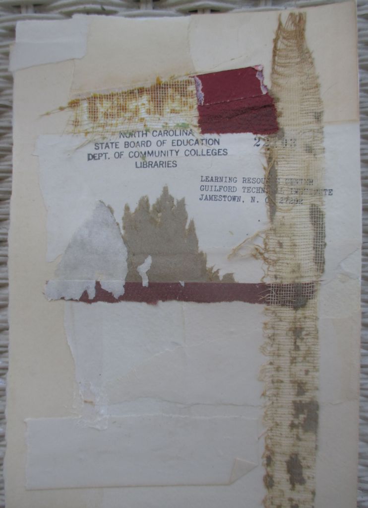Next, I kept layering this collage I began on Saturday until I was satisfied with it. I ended up pulling off a piece of book cloth meant to be the focal point but it was too overpowering. A nice textural surprise resulted when the glue pulled off bits of the paper backing.