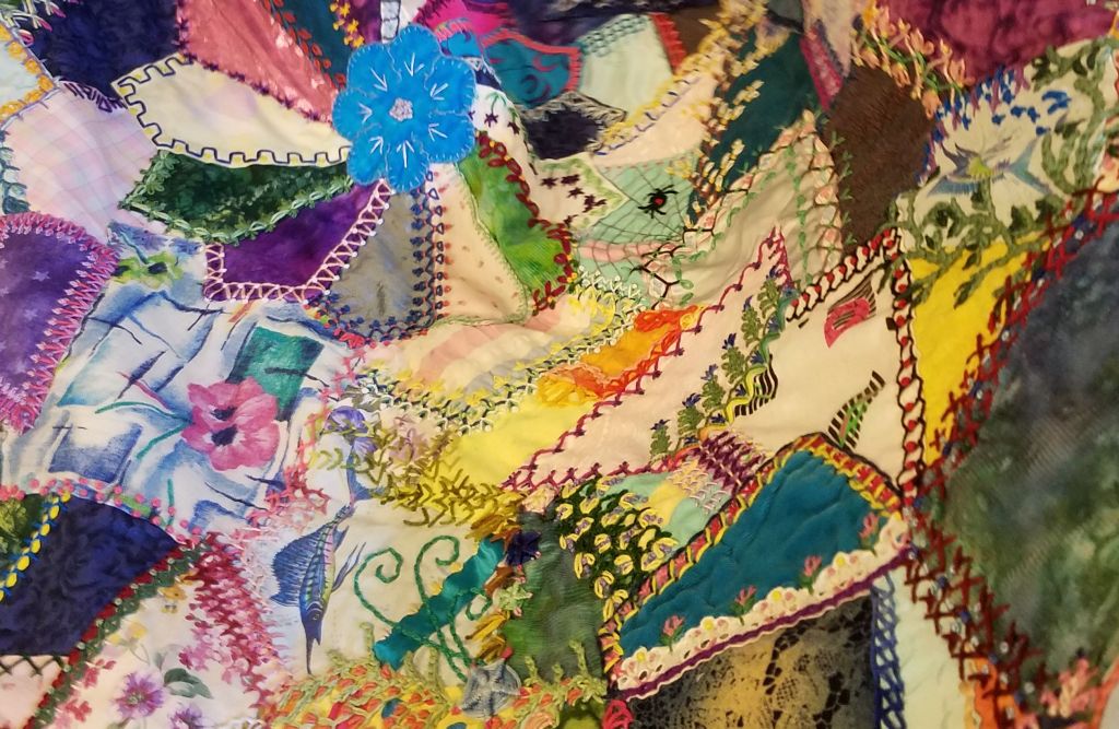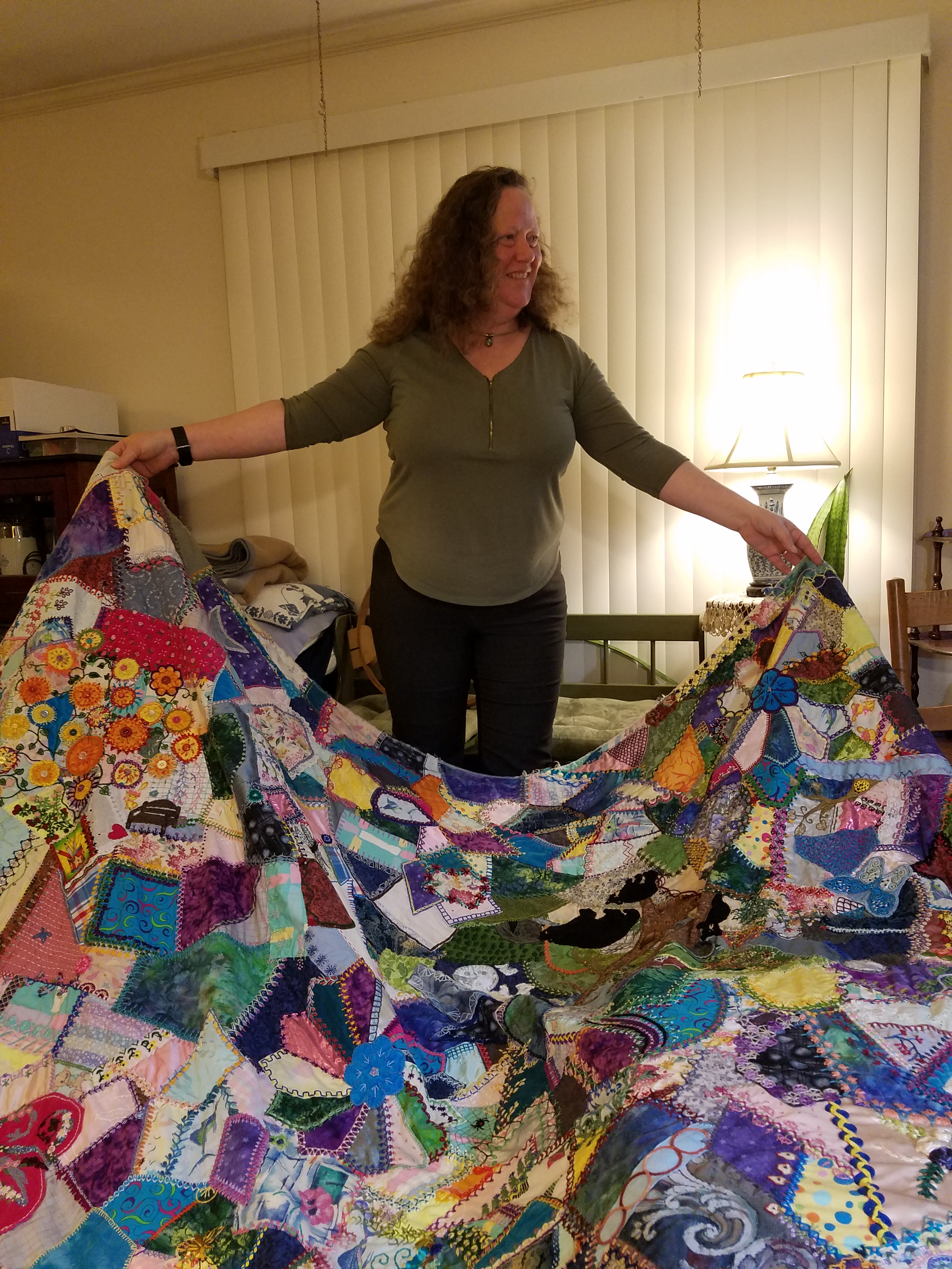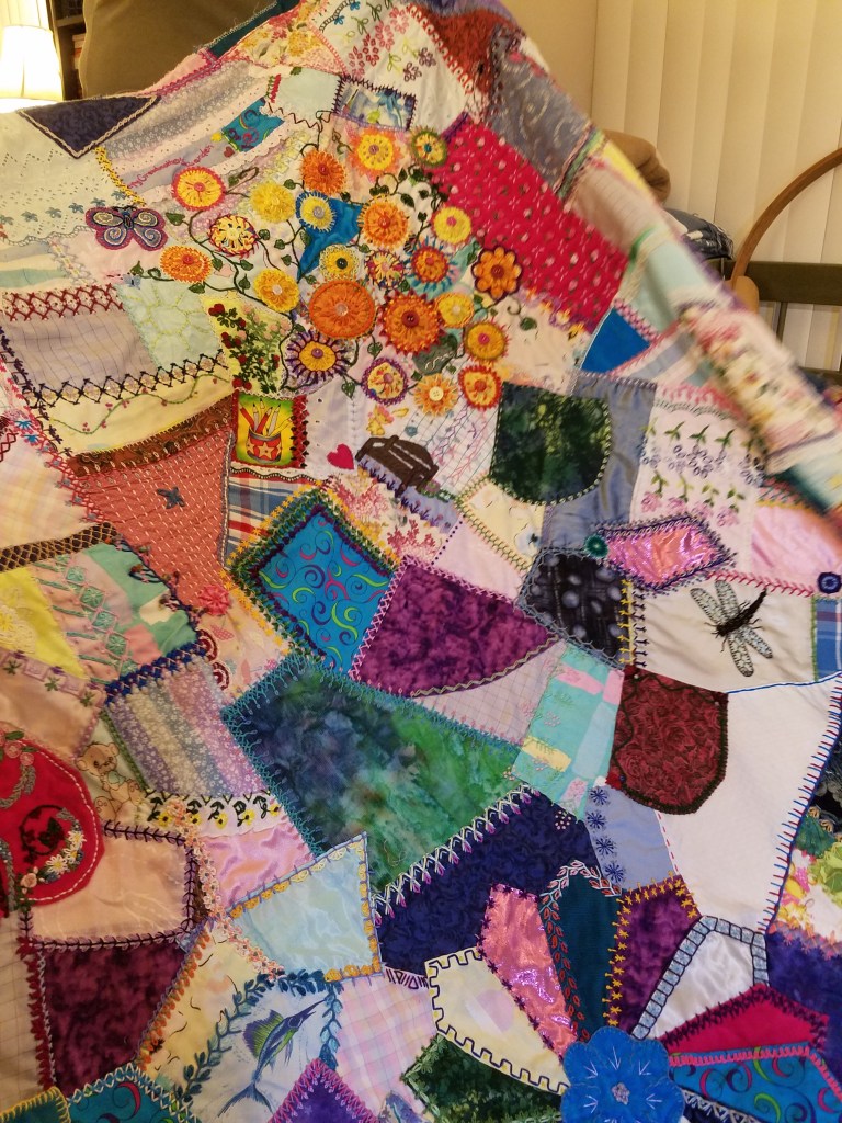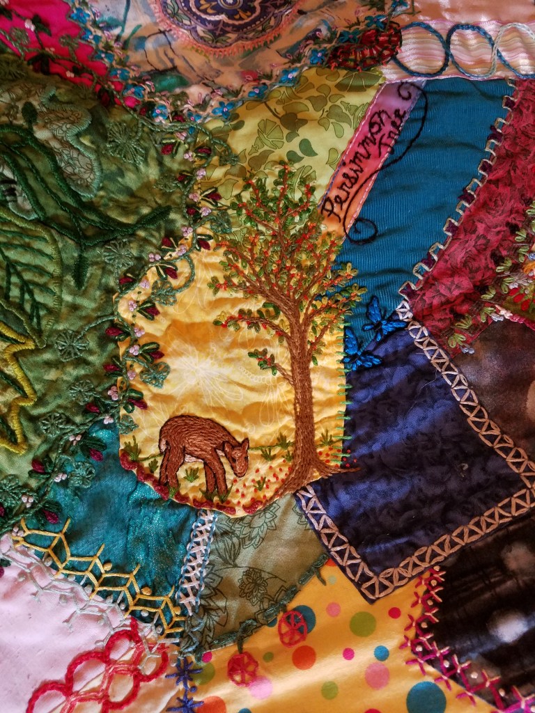 Last night I visited my friend Lisa along with a couple of other cool women for our monthly “craftivist” get-together and we took a really good look at the crazy quilt Lisa has been making for her daughter for quite a few years now. It includes scraps of her clothing. The embroidery is stunning, and there are a hundred stories in this very large quilt.
