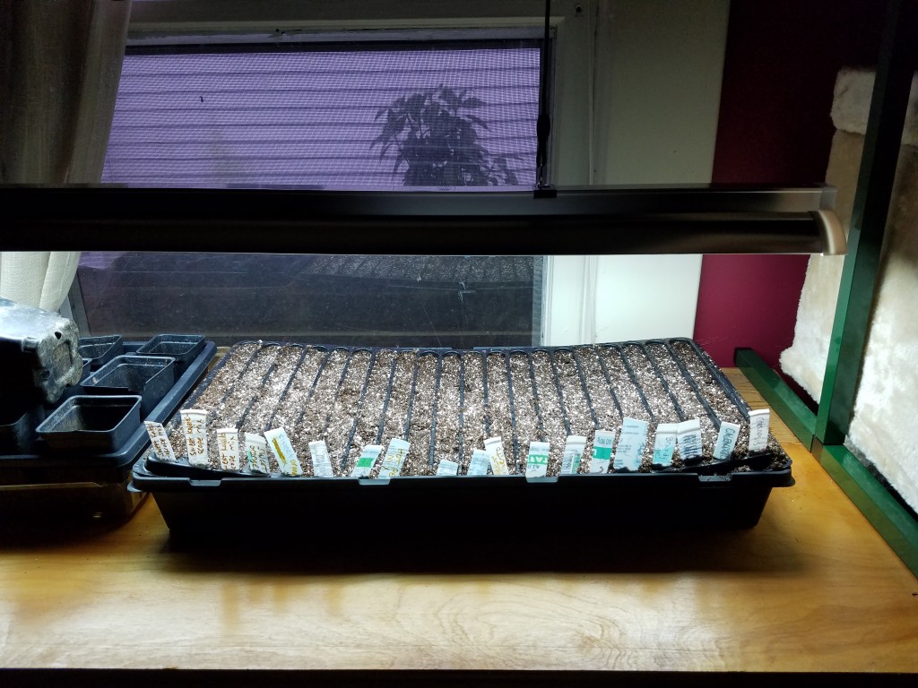Last night I finally sowed my first tray of seeds. A large variety of peppers, sweet and hot, lots of Roma tomatoes and a few Brandywines, calendula, arnica, and coreopsis. I am using a different kind of tray this year and will transplant the seedlings into bigger pots once they develop two sets of true leaves. I’ll go down to the UNCG community garden to sow some carrots and lettuce. I missed out on getting the garden club students to help me because I forgot about it with everything else going on.