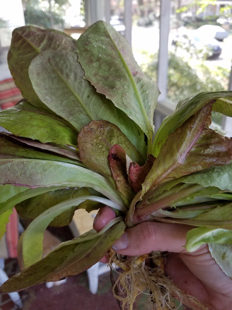 Hey, there are few pick-me-ups better than harvesting food that you planted yourself. I forgot that I had planted Rouge D’Hiver lettuce (a good winter lettuce variety) at the UNCG community garden plot in November. I haven’t been back until today because of depression and physical pain. I didn’t take my camera because it needed a charge, but look what I found, and a lot of it! Enough that it needed thinning badly so I pulled up whole plants and gave a couple to my new next-door neighbor.