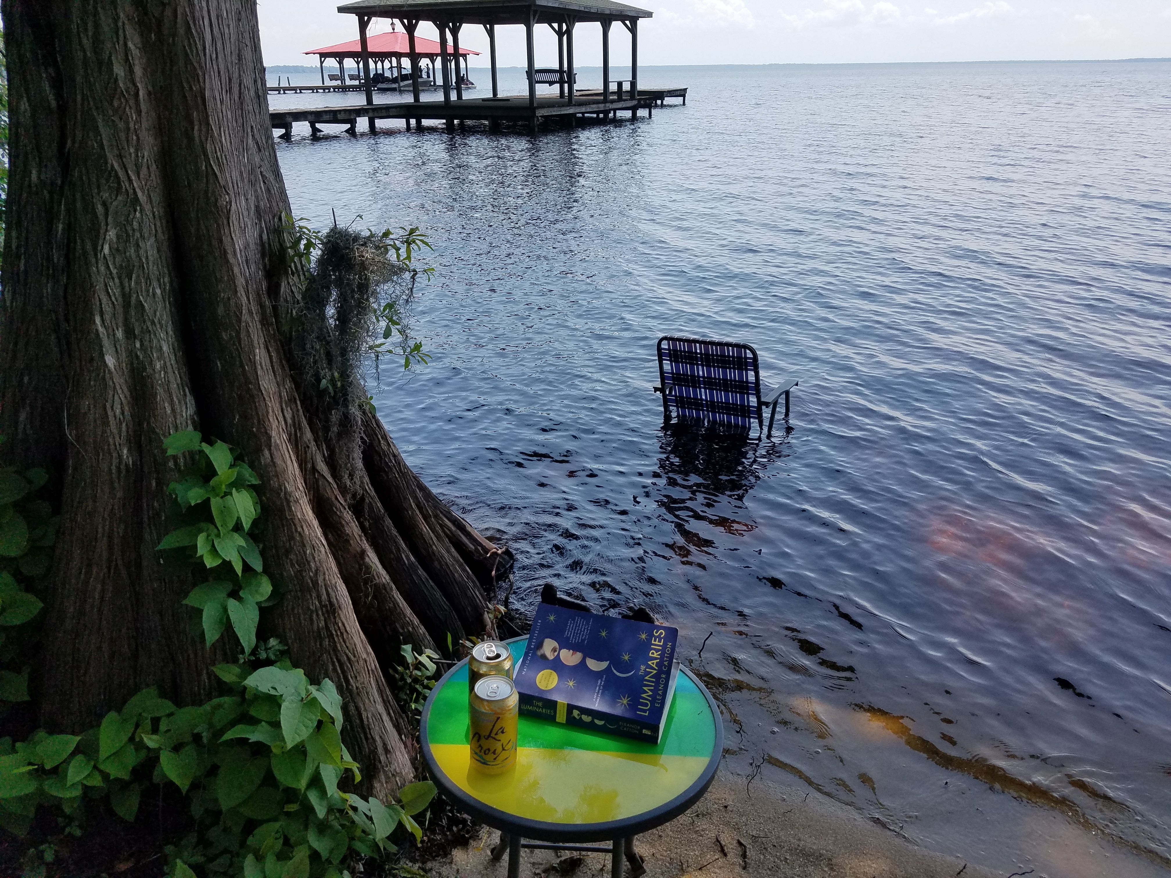 I believe that it was Saturday when Sandy and I spent time sitting in the lake and on the shore. The little fish kept nibbling at our legs and when one tried to go up my bathing suit I gave it up. I got a bit of sunburn despite sitting in the shade of the bald cypress trees. Every now and then I walked out in the water to the end of the pier next door to cool off. The water is high from all the rain right now, but it doesn’t get over your head for a long ways out.