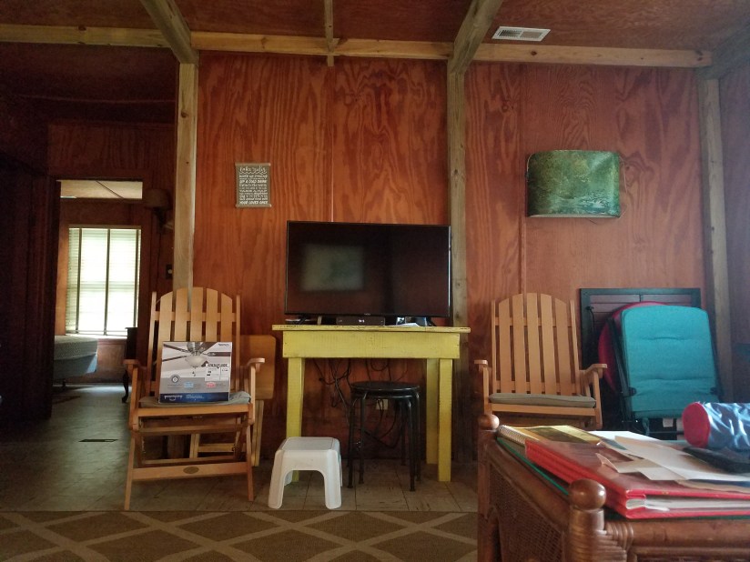Above are some shots from the living room. Along with the ceiling fan that fell apart during the last trip down here. This is what all the inside walls look like – plywood. I often see images in the wood grain.