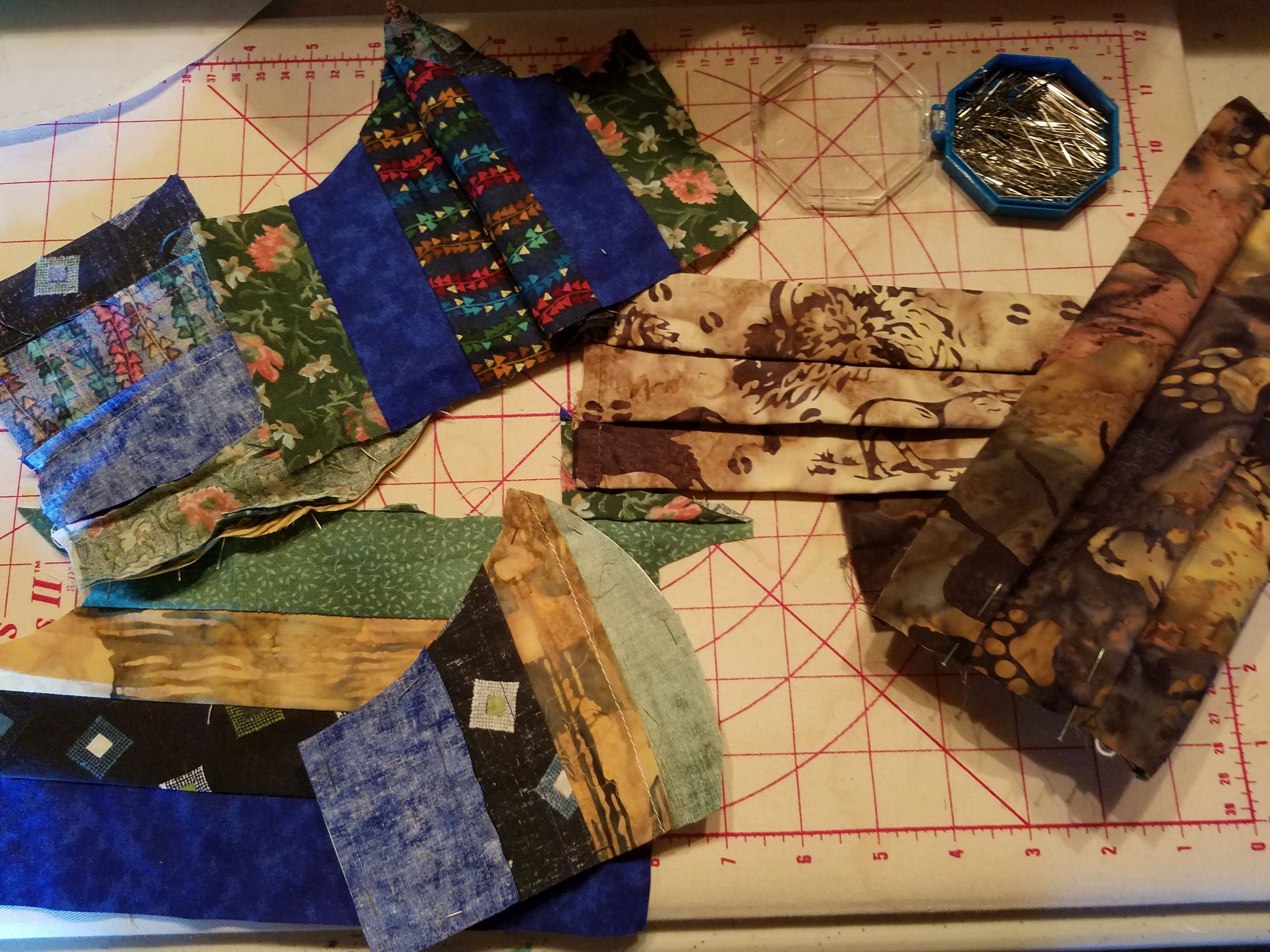Last night I cut out fabric pieces for masks. I don’t have elastic, but I am using fabric ties and hairbands and safety pins to fasten them. I found a bunch of pieced strips that I sewed together last year. The brown masks are batik fabrics with buffalo and grizzly bear designs that I bought at a quilt shop on the Blackfeet Reservation when we went to Glacier National Park in 2016.