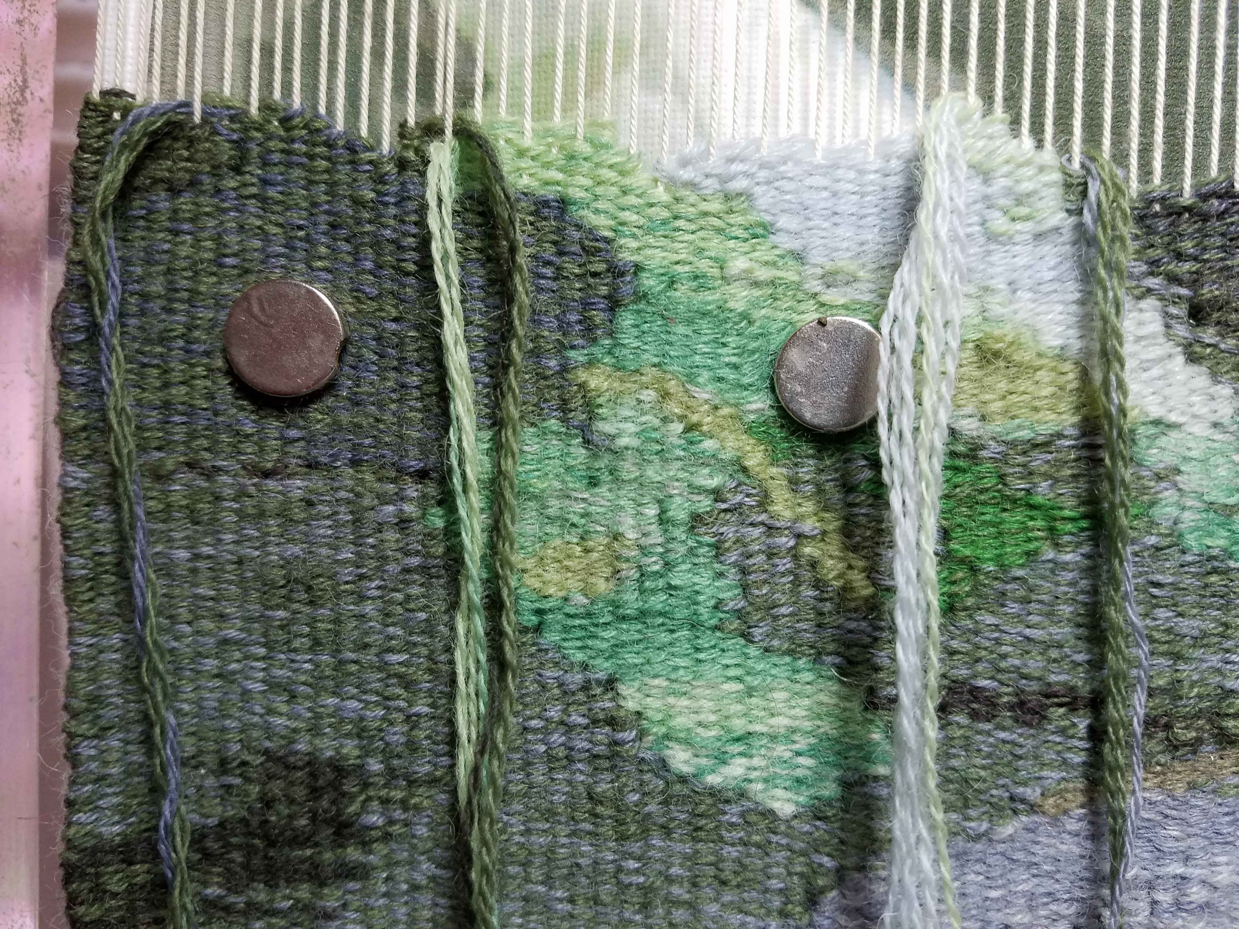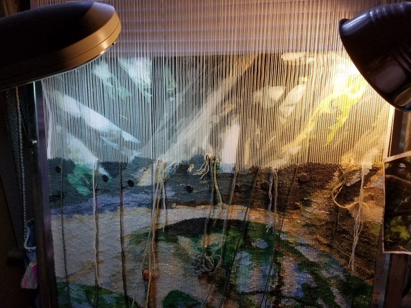 But all that work and time is wasted if I DON’T finish weaving it, and once I get it off the loom I can warp it with a much shorter warp (at the time I was warping for multiple tapestries – big mistake) and begin another weaving. Now the plan is to be less persnickety about the details and get it to a place that is even on the top and finish it as a smaller tapestry.