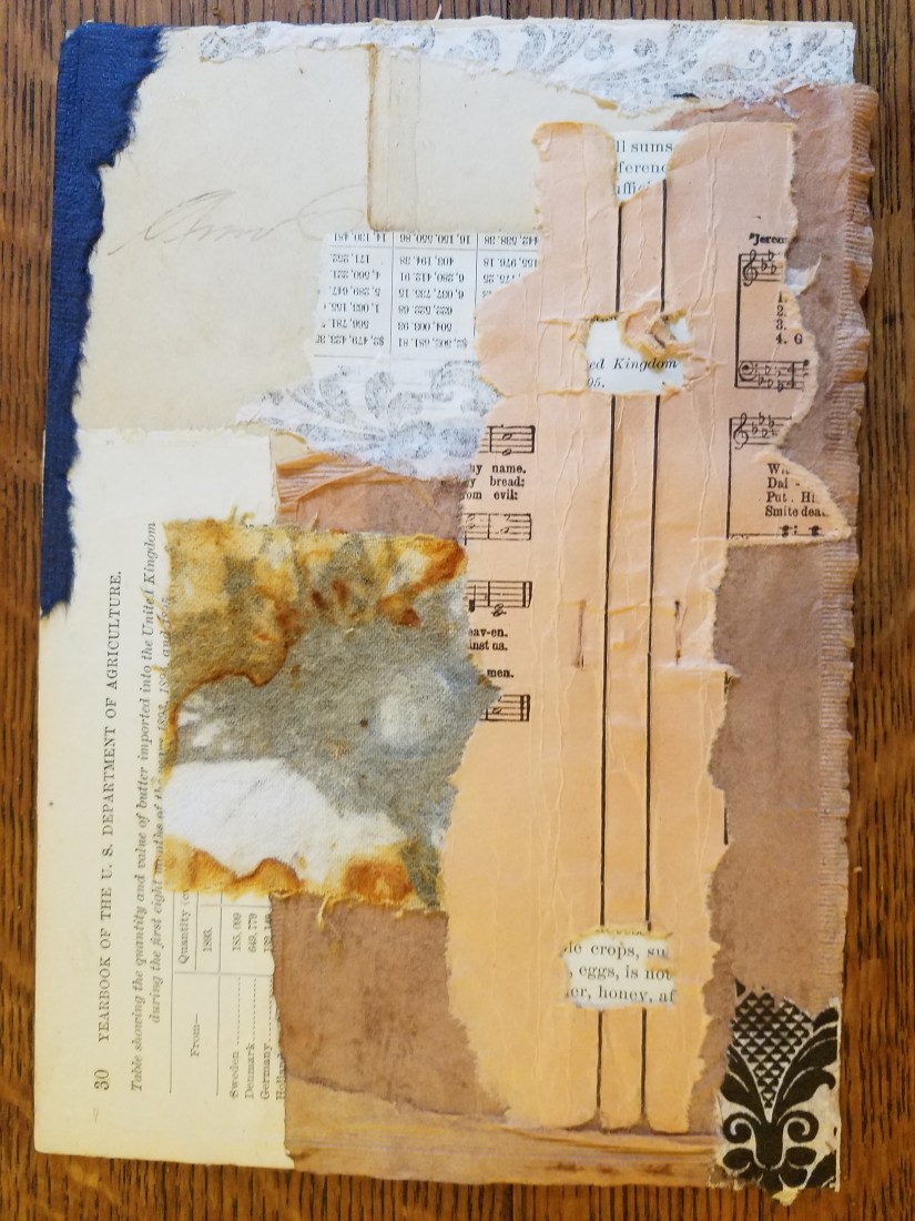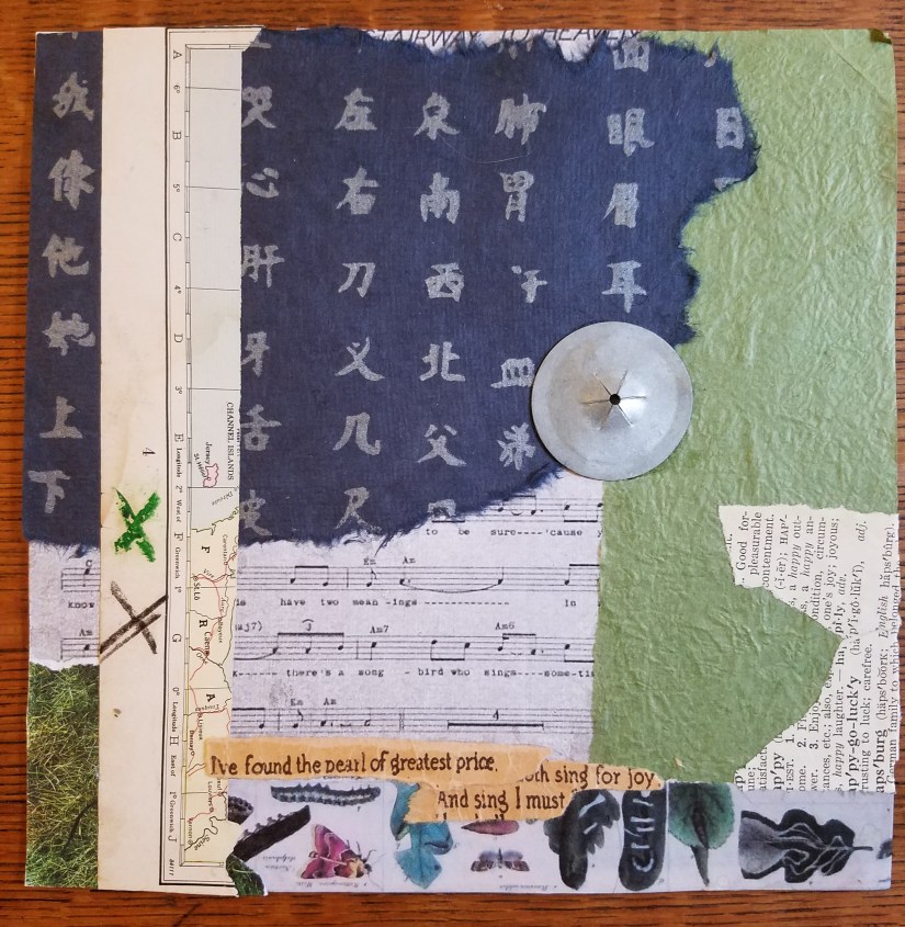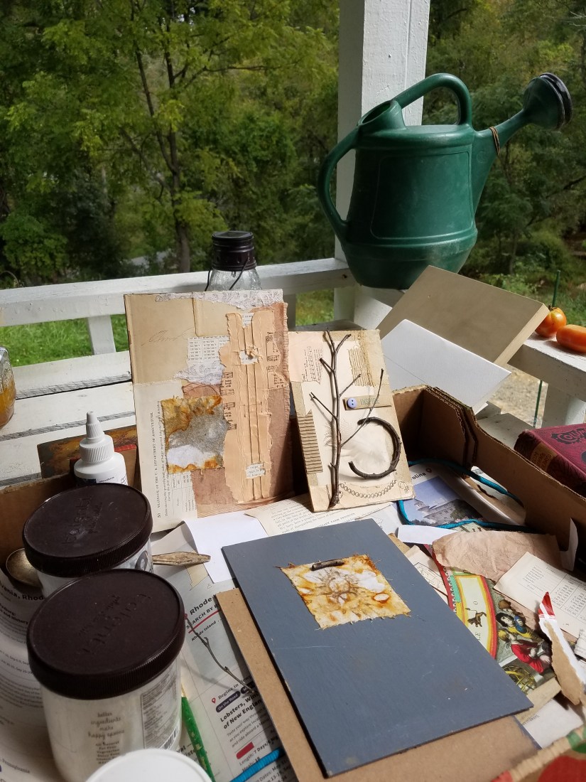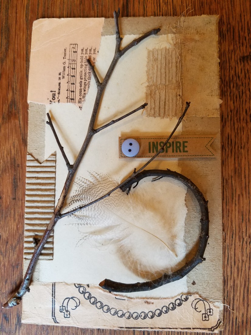 My muse was waiting for me in the mountains. The collage with the stick and feather was started at Lake Waccamaw. The one with the creek stones is in progress, and the rocks have a bit of mica/pyrite/gold glitter in them. That one and the blue green collage are based on lyrics from Stairway to Heaven.