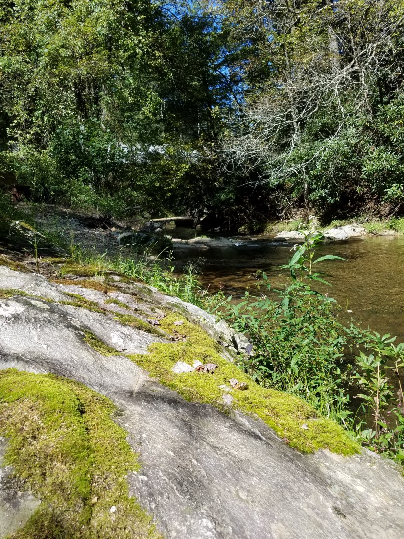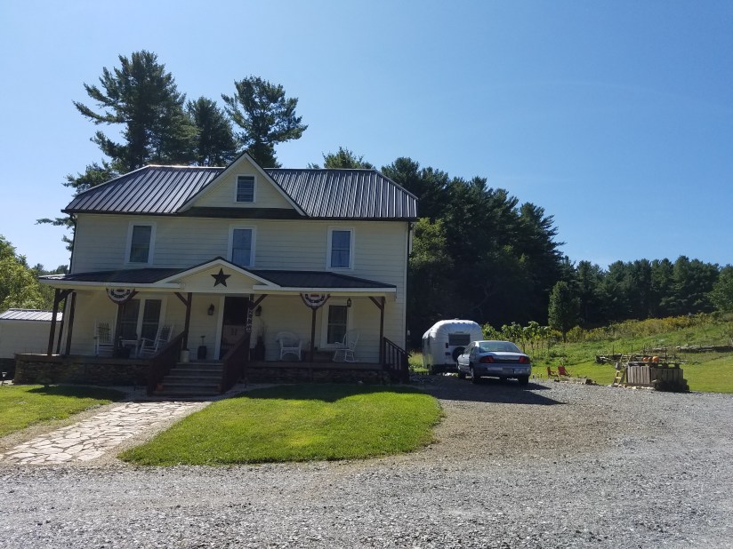 After RBG died, I decided that we really did have to get away. I had waffled until the last minute, but I found a place that we could afford that met our criteria during the week this week, an airBnB place called Wild Hare Historic Farmhouse Retreat right on the Blue Ridge Parkway near Sparta and Stone Mountain State Park, only about an hour and a half drive away. The first night we “glamped” in a 1968 Avion travel trailer parked on the property, and then we moved inside to a room with a private bathroom and a Jacuzzi tub. There is a creek with rapids and a small beach on the property, which was my main criteria. I wanted to get next to running water over rocks.
