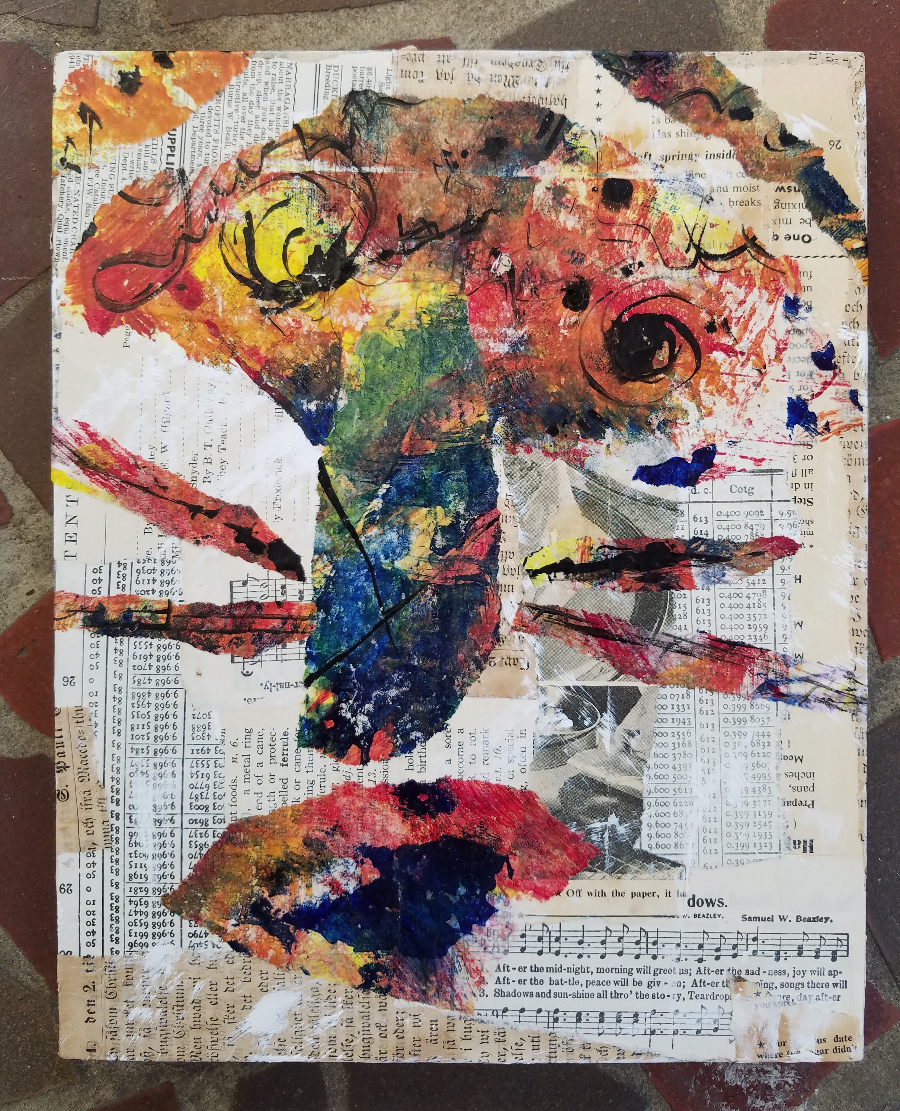Last weekend I had a lot of fun in Leighanna Light’s “Layered Faces” Zoom class. It is definitely not my style but it was a lot of fun and got me out of my head. Here are the photos from my piece after day one and at the end. I got a wild feline feel from the face as it was developing so I went with that. Sandy was all blah about it until I finished and then he was saying “Don’t do another thing to it! It’s perfect!” LOL. I won one of Leighanna’s faces in a random drawing on the second day, so my luck was with me this week.