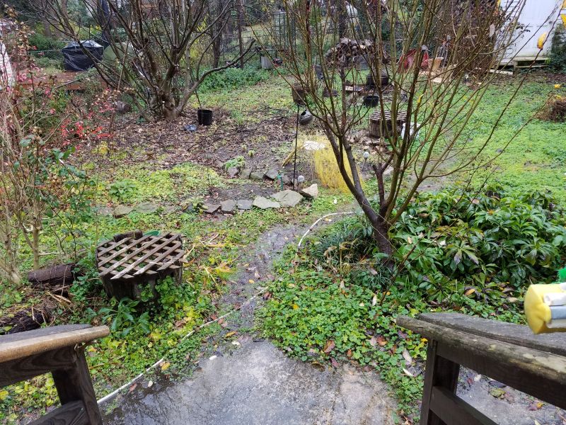 Here it is Wednesday, with icy cold rain falling outside. Fortunately the ice is not sticking here, but it has rained a LOT and that means water flowing through the Back Forty from two directions, which culminates in a pond in my next door neighbor’s back yard. This, despite an effort to redirect the water to a large burrow under that garden bed. It’s not a big problem for us any more, but I feel sorry for the next door neighbors. They are not there right now, though.