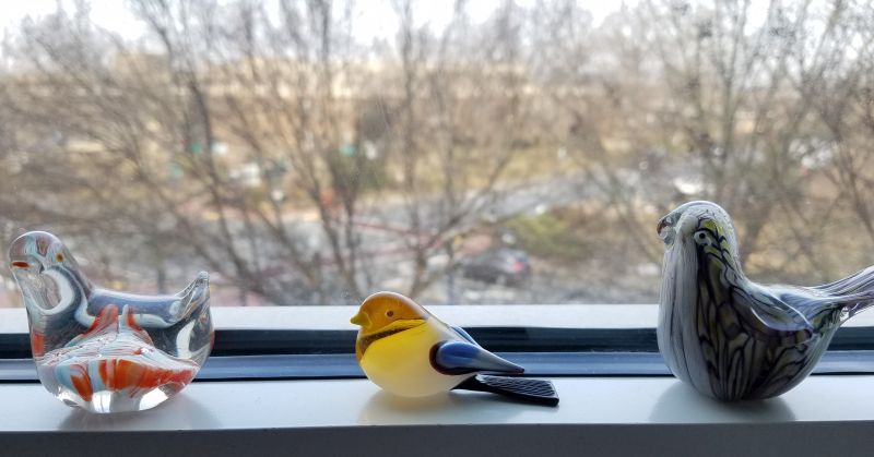 I have a collection of glass paperweights. At one time it was such a delight to search flea markets, yard sales, and antique/thrift stores for them. After a while I decided to stop collecting them because we have so many knick-knacks in our house that it is a dusting nightmare. I gave a lot of my paperweights away, but I kept the ones that had meaning to me. Here are a few birds from my windowsill in my office. The yellow one came from Florence, Italy. Sitting here at my work desk at home, I see the one that used to be in my mother’s living room for years, and the one that she bought for me when she went to Vienna. I will be giving away more paperweights before long, but those are keepers.