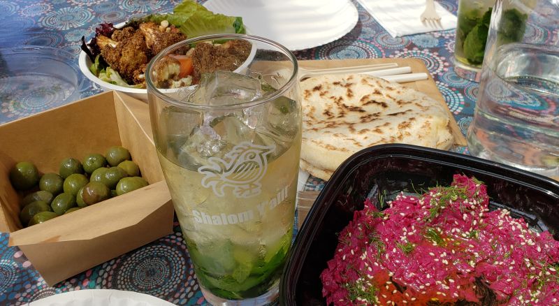 Around the block was a highly rated restaurant named Shalom Y’all. I was intrigued with how they might combine Mediterranean and U.S. Southern cuisine, but that wasn’t the deal at all. We ordered takeout and it was brought to us at a covered picnic table on the street. It was one of the best meals we had, and it was vegetarian. Roasted beet tahina spread, hot puffy pita bread, fried cauliflower atop a salad with hazelnuts, olives, and fresh mint tea. If I ever go back, I will definitely go here again.