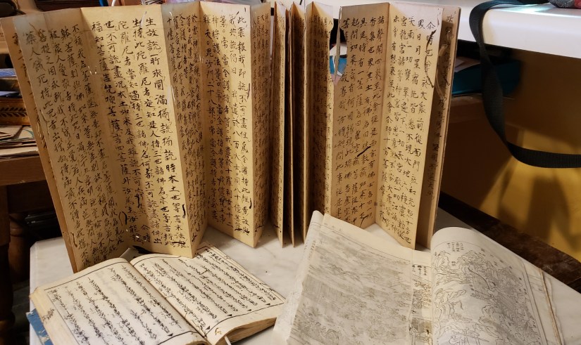 I realized the potential for me to go completely nuts over these Japanese papers so I limited myself to a $30 budget. I picked out three small books, and two of them had bookworm holes and tunnels, which made me ecstatically happy. The holes in the accordion book looked like snowflake or paper doll cutting. The open book on the right bottom is full of illustrations and maps on very thin paper with lots of fold-outs.