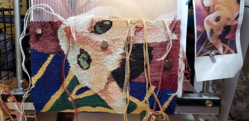 I have made a little bit of progress on my tapestry, “Rascal and Sissy Share the Sunbeam,” this past week. There’s more than one reason why I named my studio “Slow Turn Studio,” but a big one is that I tend to choose media that take a long time, and even if they don’t, I take my time anyway. In the case of this tapestry, I have made the color blending so complicated that I have a hard time getting my brain into it most days. If I can relax into it, I do better. However, no matter what, I do a lot of unweaving and reweaving, and that makes an already slow art glacial in speed.
