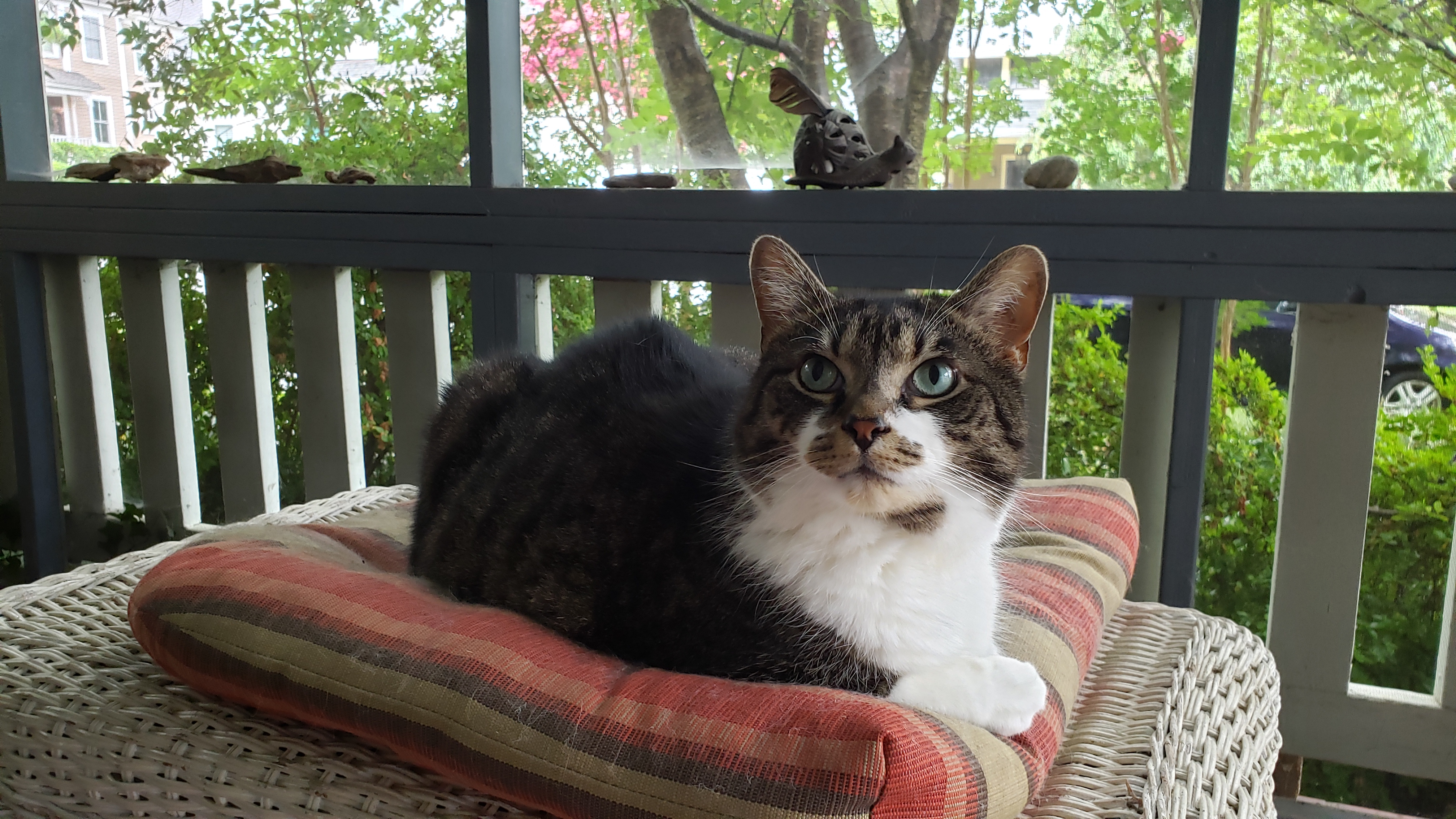 His favorite place was on the front porch. My bed was absolutely his territory and if he caught Pablocito on it, usually within five minutes there would be a fight if Pablocito didn’t run first. He jumped up and meowed when Sandy walked into the room and then would follow him to the sofa or the man cave.