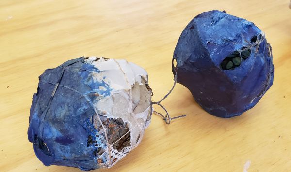 My first birdie was dipped in bleached abaca pulp, then later I wrapped some paper on it. I dyed it in indigo, then glued (with methylcellulose) a light piece of paper to its underside. I might color it later to make it look more bluebirdish. Also need to add eyes.