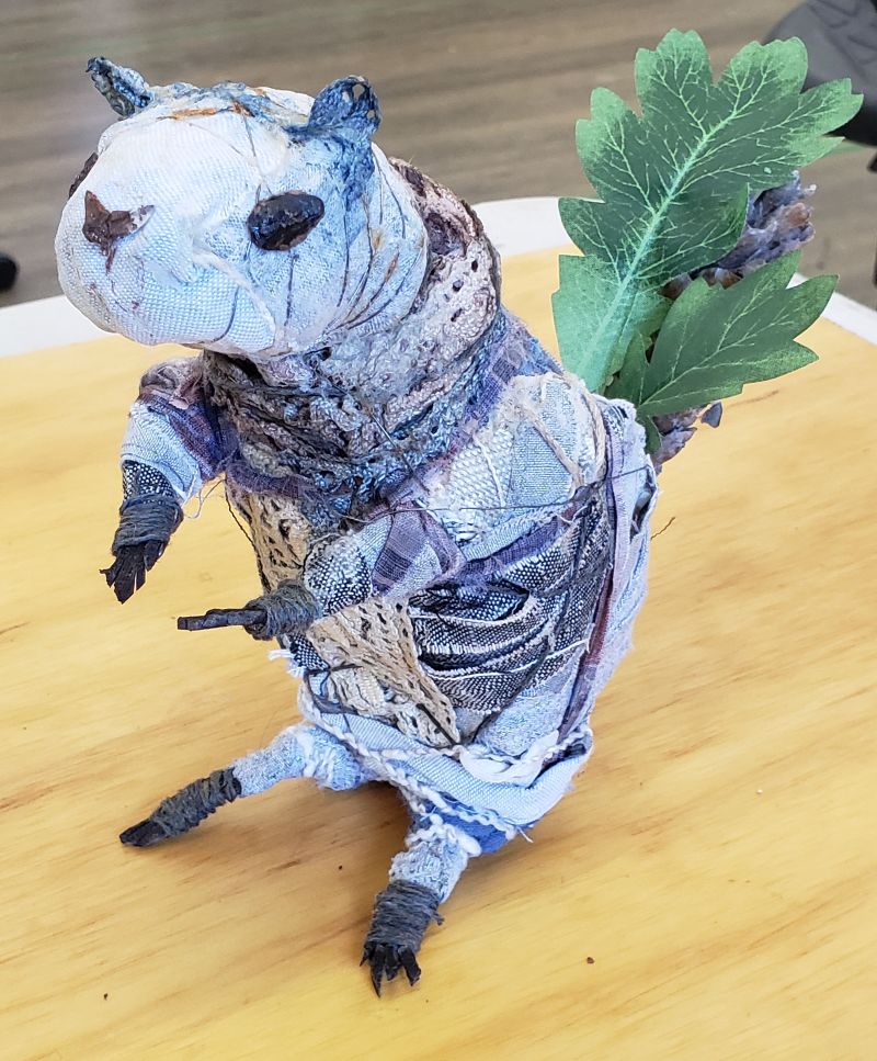 Finally, Miz Shirley Squirrely. I began Shirley in Bryant’s “Wrapping Wild” class last summer, and brought her with me to finish her in this class. I wrapped the dyed lace around her neck and front, attached a pulp-dipped pine cone for her tail, made ears out of lace and used bits of ink painted pine cone pieces for her eyes and nose. The silk leaf is her “party dress.” Her paws are leather from an upcycled belt.