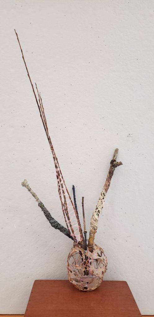 For this one, I was playing with strips of kozo and a sheet of paper I had made with kozo strips embedded in it, but it was not behaving so I tore it in two and attached it to this trio of sticks. The “back” has the lacy kozo bark that you tease apart but as much as I like the look, I found that the process made my blood pressure rise when I had trouble controlling it.