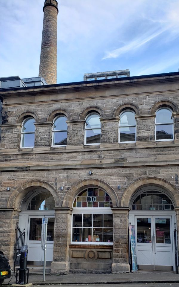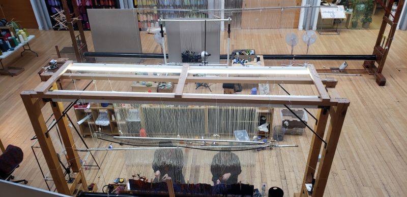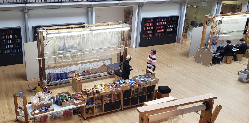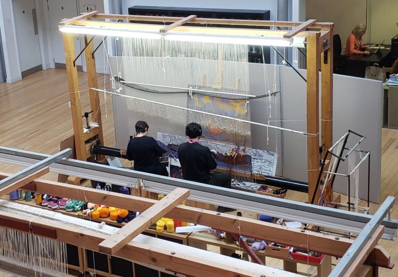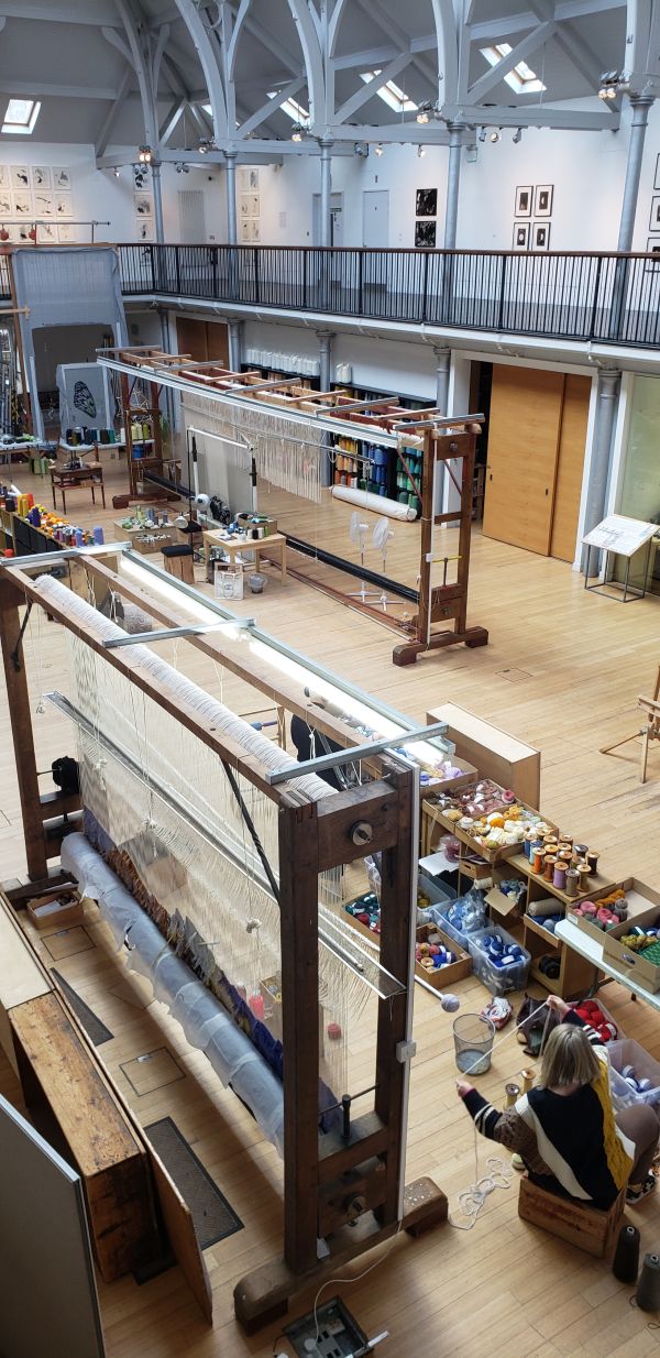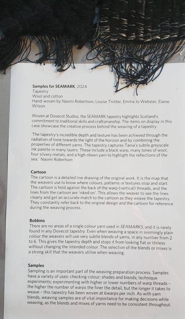 After a quick trip to the closest grocery to get bandages, antiseptic cream, and ibuprofen, I headed to Dovecot Tapestry Studios, a short walk away and an item on my bucket list. I wanted to go there more than any other place in Edinburgh. I ended up getting there after the gallery to see the tapestry studio had closed. I had already seen the Chris Ofili exhibition in London when we went to the National Gallery in 2017, so I wandered about the cafe and looked at the small tapestries on the walls there, and picked up a few things in the gift shop, including a book about Archie Brennan. I told the staff at the desk that I had studied under Archie, and why I probably could not come back when the gallery was open. They made a call and escorted me up to the gallery so I could see the tapestry weavers at work and the exhibition around the balcony walls.