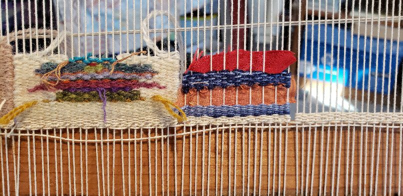There are a few other sections of warp on this frame loom that I expect for a warp thread or two to break. I decided to do these separately for that reason (I had finished warping when I noticed the fraying) and I am using them to play with small leftover bits of color and fibers. If they break, I can cut them off to use for collage or whatever without messing up the diary.