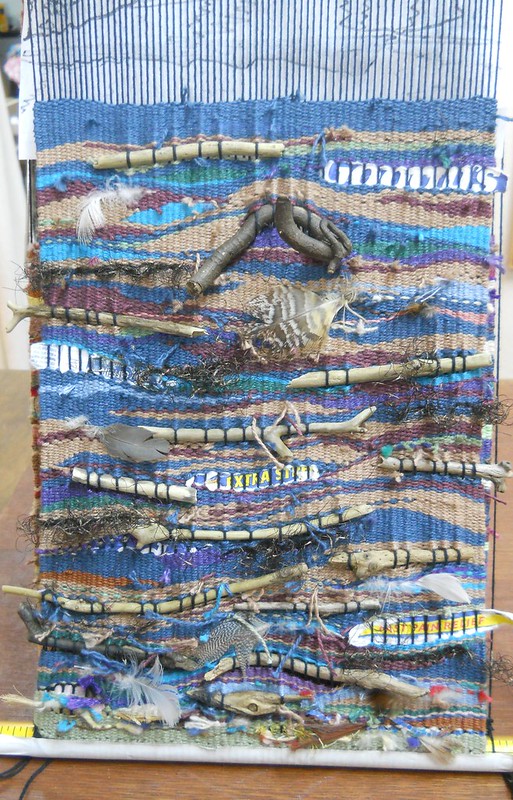 The Lake Waccamaw found object tapestry is almost done. I’ve finished weaving it and once I take it off the loom I’m going to sew the warp strings over a driftwood stick and into the back of the cloth. Then I’m going to sew a few more things to it that I was afraid would get broken with all the bumping around, such as mussel shells and a few other fun things.