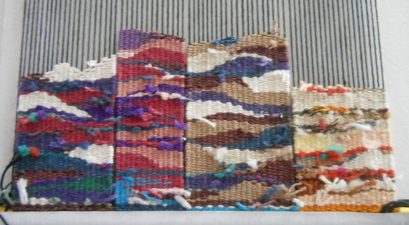 The cuffs are also almost finished. The weaving is done. Once I cut them off I’m going to line the backs with cloth, sew buttons on the front, and attach a loop to go around a button to fasten. I’ll play with it and figure it out. This is on the back of the loom on the other side of the Lake tapestry.