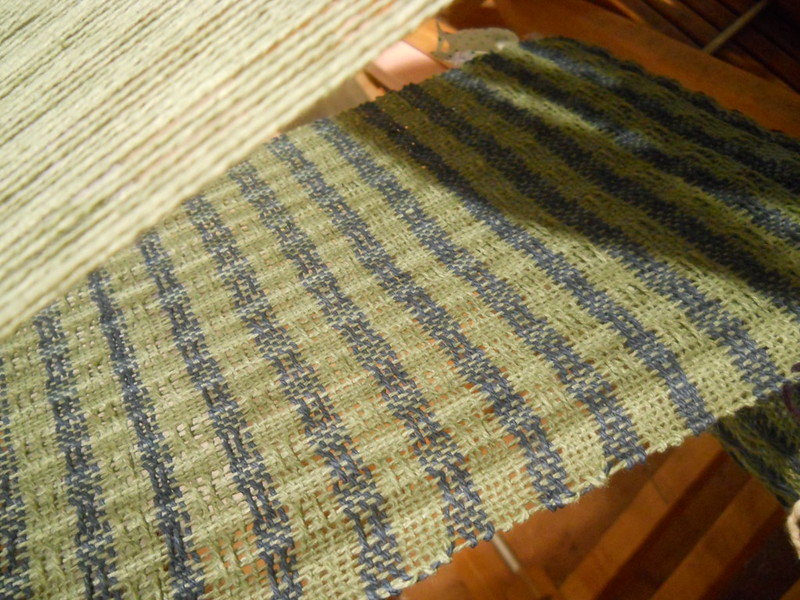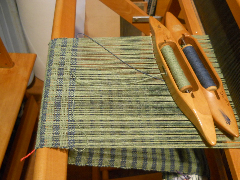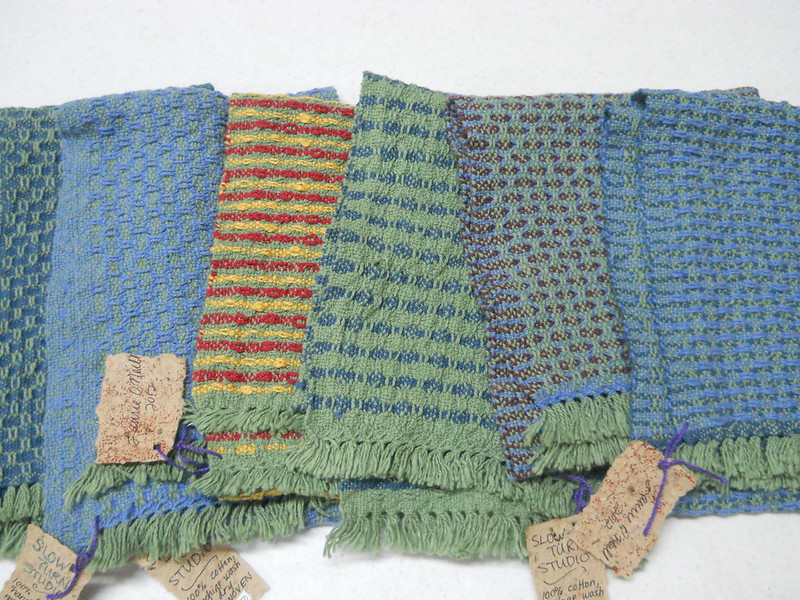 My summer has mainly been consumed with weaving so here’s an update. The cotton huck scarves came off the loom late last week. I wove six different ones off the same light green warp. I washed them in hot water/cold rinse and dried them in the dryer because I like to make sure that my work has shrunk as much as it is going to and people can throw them fearlessly in the washing machine if needed. Then I cut them apart, trimmed them up, and washed them again, this time on warm/warm. They softened up nicely but are a bit thick. I’ll go to a looser warp sett for the next batch. And they shrank a good bit more that I expected so I will weave them longer for the next batch. My friends told me that they like shorter scarves anyway, which surprised me. They will look good pinned on the front side with a nice brooch.