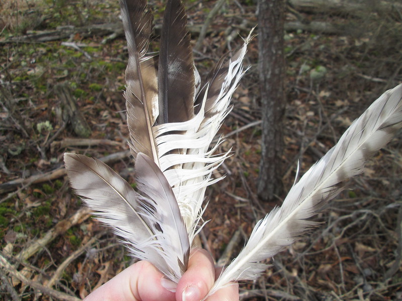 Either we took a wrong turn or the trail vanished. It was in need of maintenance. We ended up crossing a power line right-of-way, in which I identified several dye plants and found a bouquet’s worth of hawk feathers.