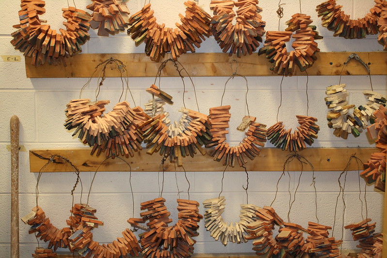 I’m done working with wet clay and I’m busy finishing the book covers, mainly with simple oxides and stains, and preparing paper signatures for binding. One of the books has a LOT of holes for caterpillar stitches and the holes are too big for the linen threads that I planned to use. I’m going to try one today and see if I need to twist a double strand. I’d rather not make it any more complicated than I have to.